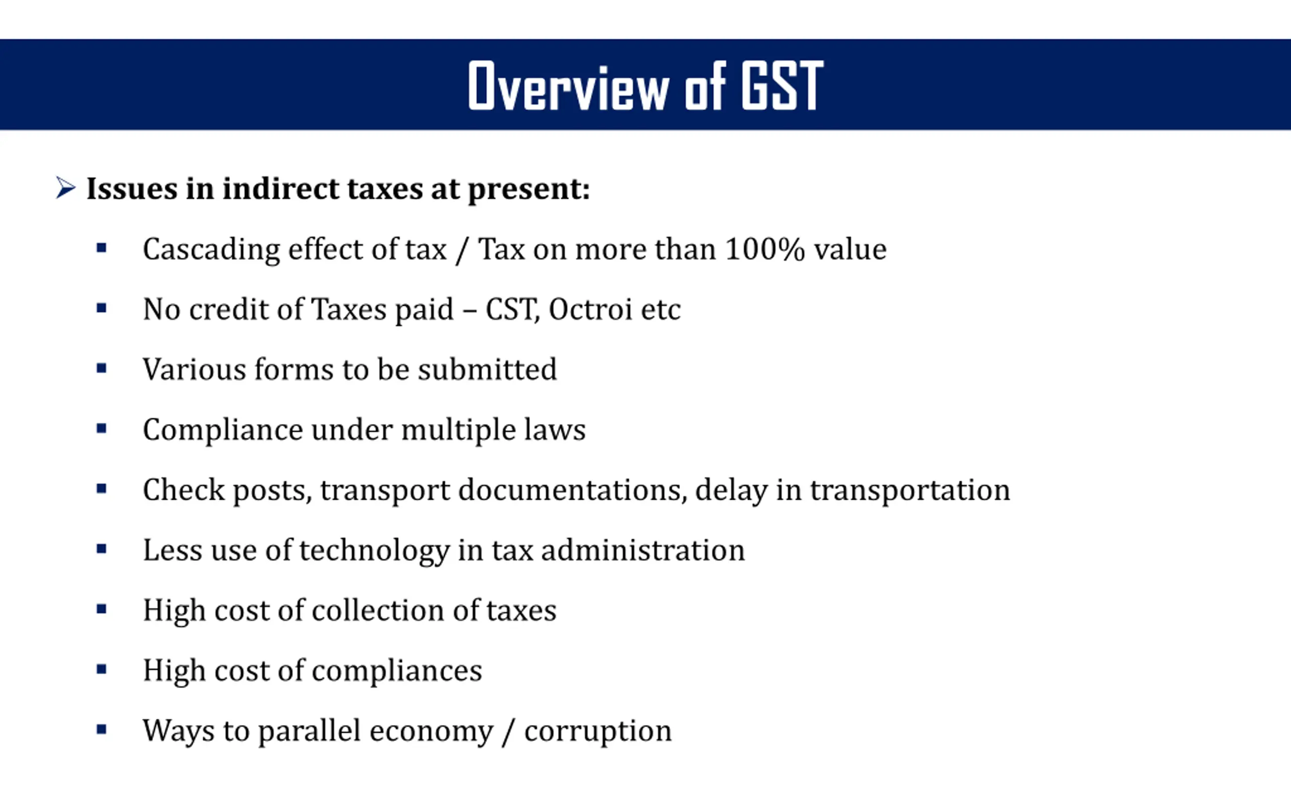 Overview of GST Issues in indirect taxes at present: Cascading effect of tax / Tax on more than 100% value No credit of Taxes paid CST, Octroi etc Various forms to be submitted Compliance under multiple laws Check posts, transport documentations, delay in transportation Less use of technology in tax administration High cost of collection of taxes High cost of compliances Ways to parallel economy / corruption