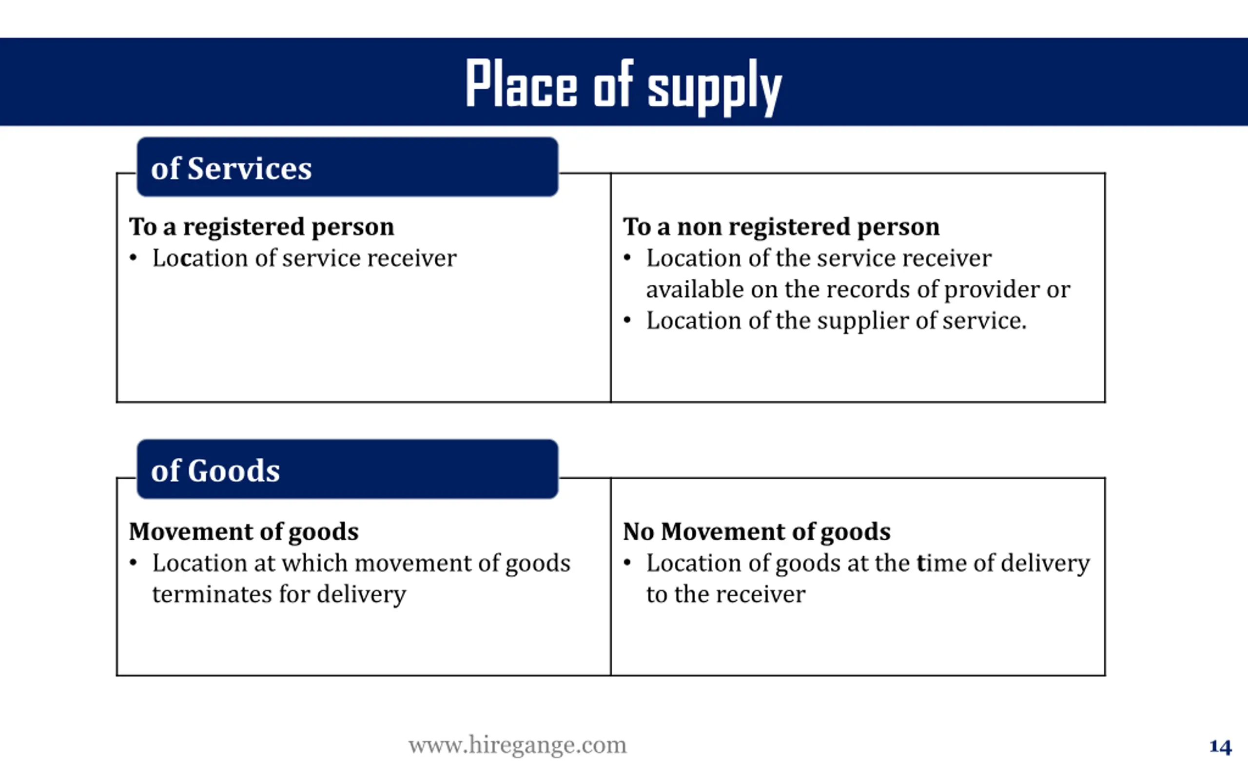 Place of supply of Services To a registered person Location of service receiver To a non registered person Location of the service receiver available on the records of provider or Location of the supplier of service. of Goods Movement of goods Location at which movement of goods terminates for delivery No Movement of goods Location of goods at the time of delivery to the receiver www.hiregange.com 14