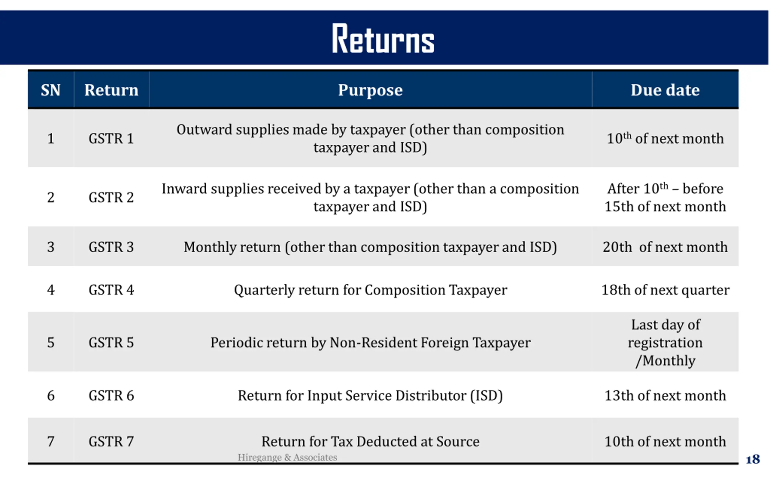 Returns Types of Returns SN Return Purpose Due date Outward supplies made by taxpayer (other than composition taxpayer and ISD) 1 GSTR 1 10th of next month Inward supplies received by a taxpayer (other than a composition taxpayer and ISD) After 10th before 15th of next month 2 GSTR 2 3 GSTR 3 Monthly return (other than composition taxpayer and ISD) 20th of next month 4 GSTR 4 Quarterly return for Composition Taxpayer 18th of next quarter Last day of registration /Monthly 5 GSTR 5 Periodic return by Non-Resident Foreign Taxpayer 6 GSTR 6 Return for Input Service Distributor (ISD) 13th of next month 7 GSTR 7 Return for Tax Deducted at Source Hiregange & Associates 10th of next month 18