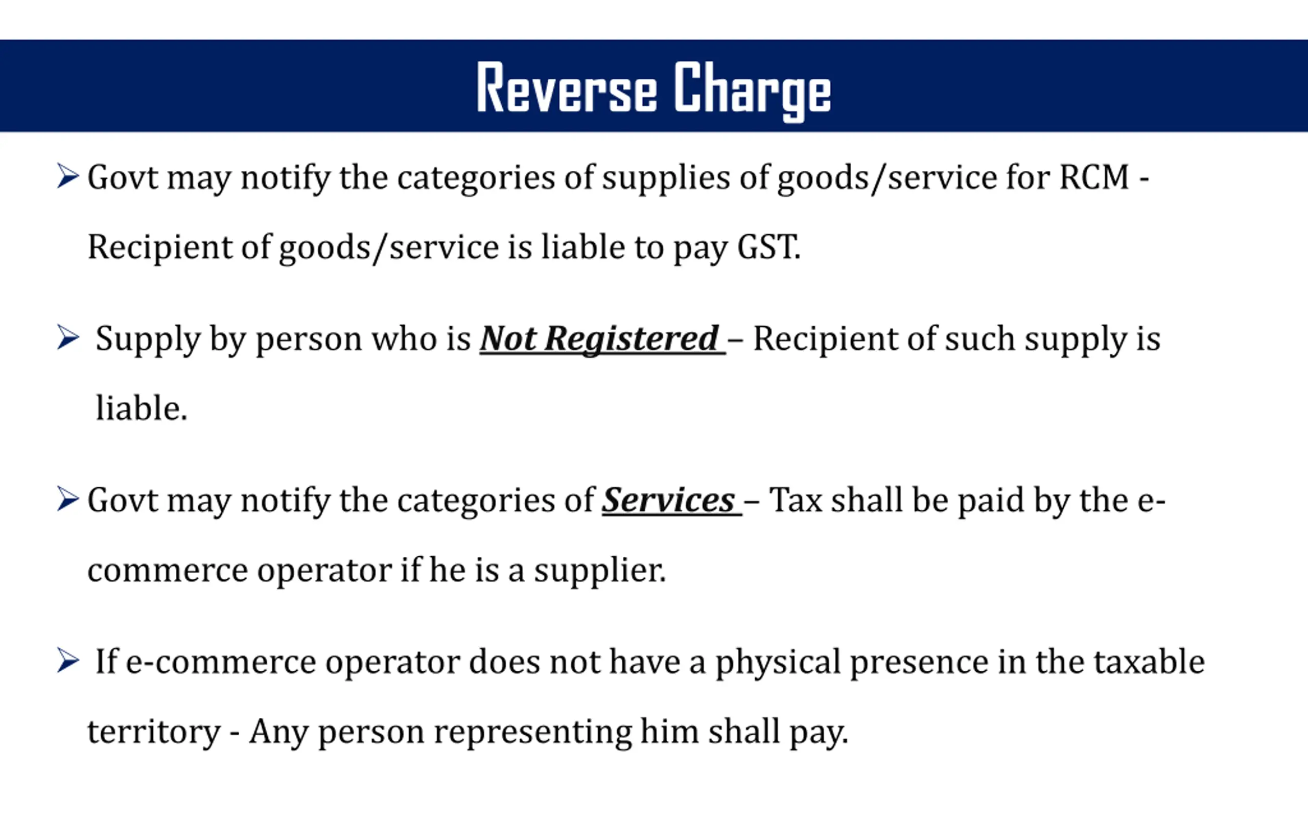 Reverse Charge Govt may notify the categories of supplies of goods/service for RCM - Recipient of goods/service is liable to pay GST. Supply by person who is Not Registered Recipient of such supply is liable. Govt may notify the categories of Services Tax shall be paid by the e- commerce operator if he is a supplier. If e-commerce operator does not have a physical presence in the taxable territory - Any person representing him shall pay.
