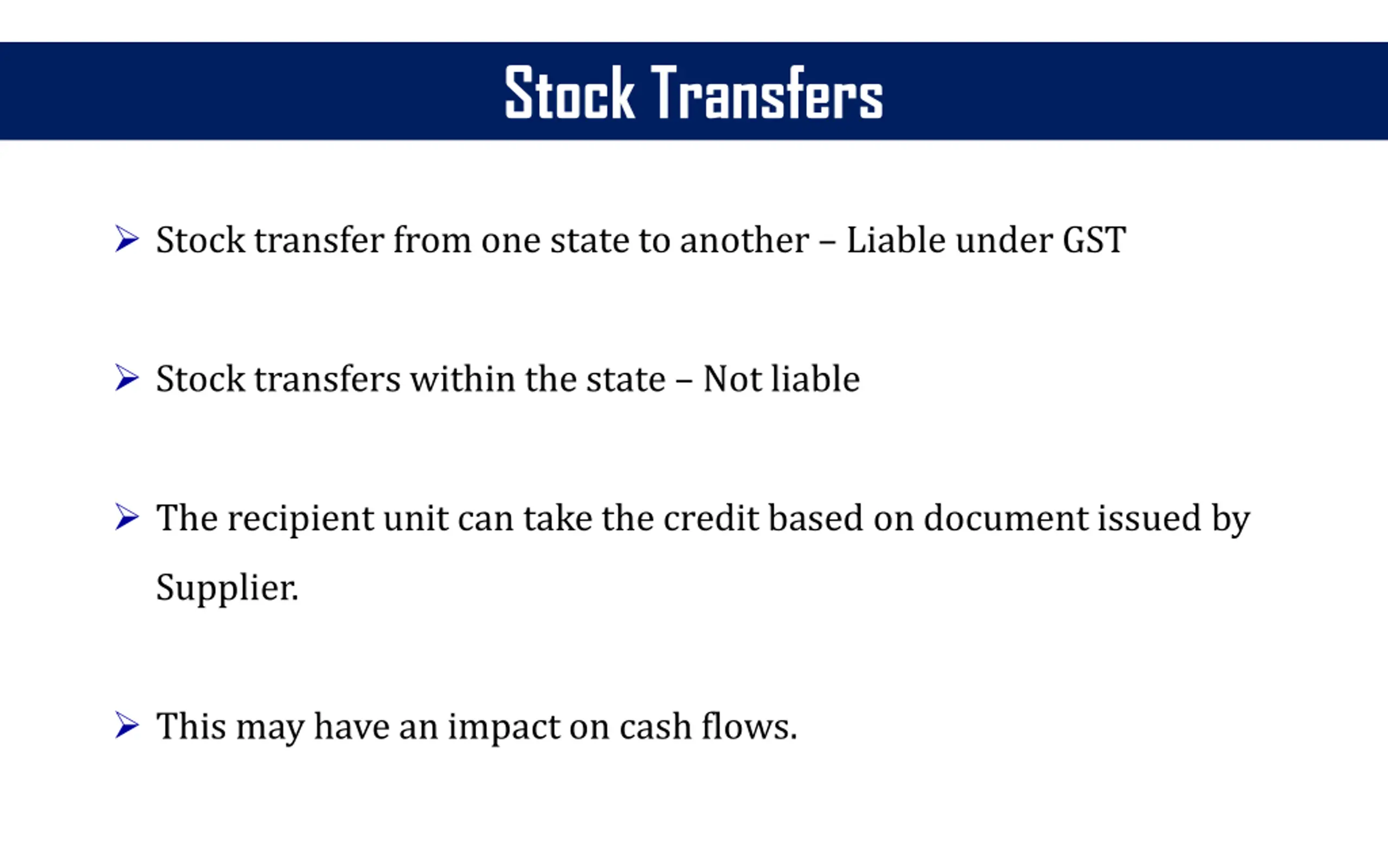 Stock Transfers Stock transfer from one state to another Liable under GST Stock transfers within the state Not liable The recipient unit can take the credit based on document issued by Supplier. This may have an impact on cash flows.