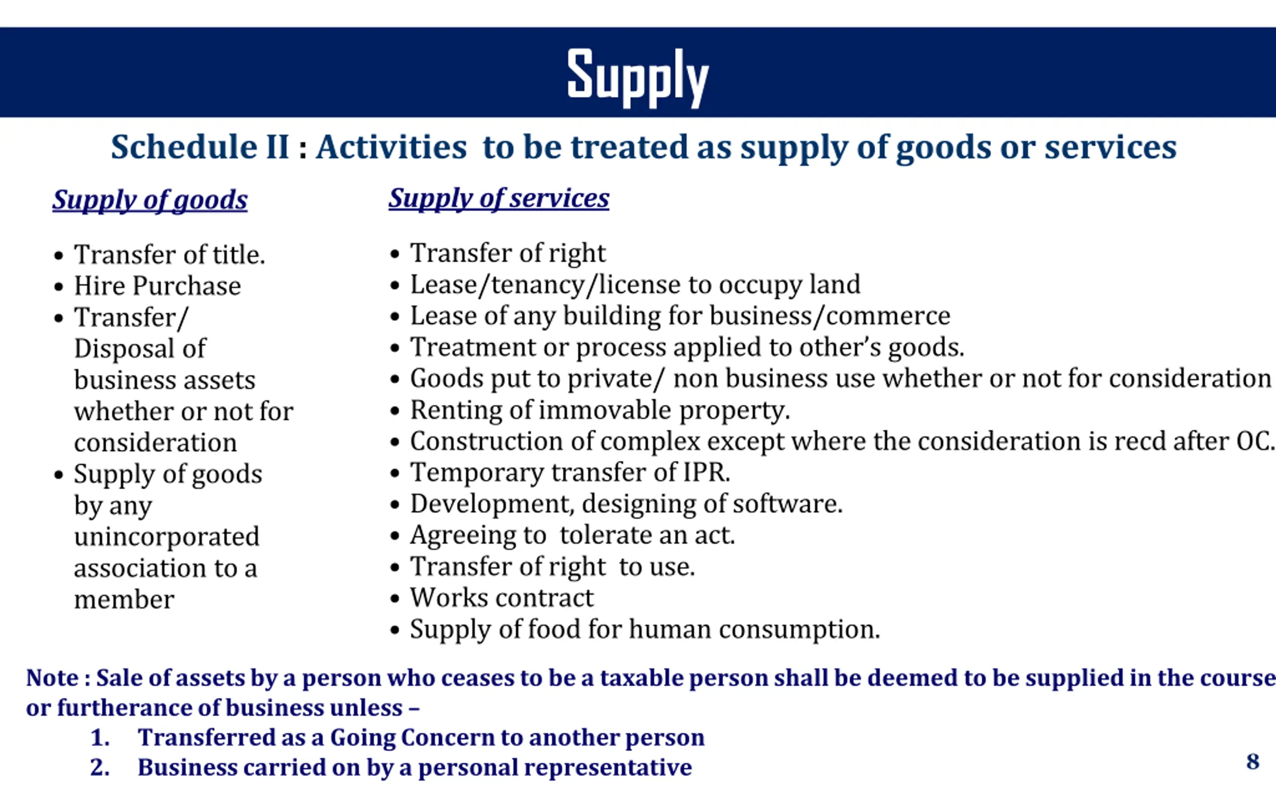 Supply Schedule II : Activities to be treated as supply of goods or services Supply of services Supply of goods Transfer of right Lease/tenancy/license to occupy land Lease of any building for business/commerce Treatment or process applied to other s goods. Goods put to private/ non business use whether or not for consideration Renting of immovable property. Construction of complex except where the consideration is recd after OC. Temporary transfer of IPR. Development, designing of software. Agreeing to tolerate an act. Transfer of right to use. Works contract Supply of food for human consumption. Transfer of title. Hire Purchase Transfer/ Disposal of business assets whether or not for consideration Supply of goods by any unincorporated association to a member Note : Sale of assets by a person who ceases to be a taxable person shall be deemed to be supplied in the course or furtherance of business unless 1. Transferred as a Going Concern to another person 2. Business carried on by a personal representative 8