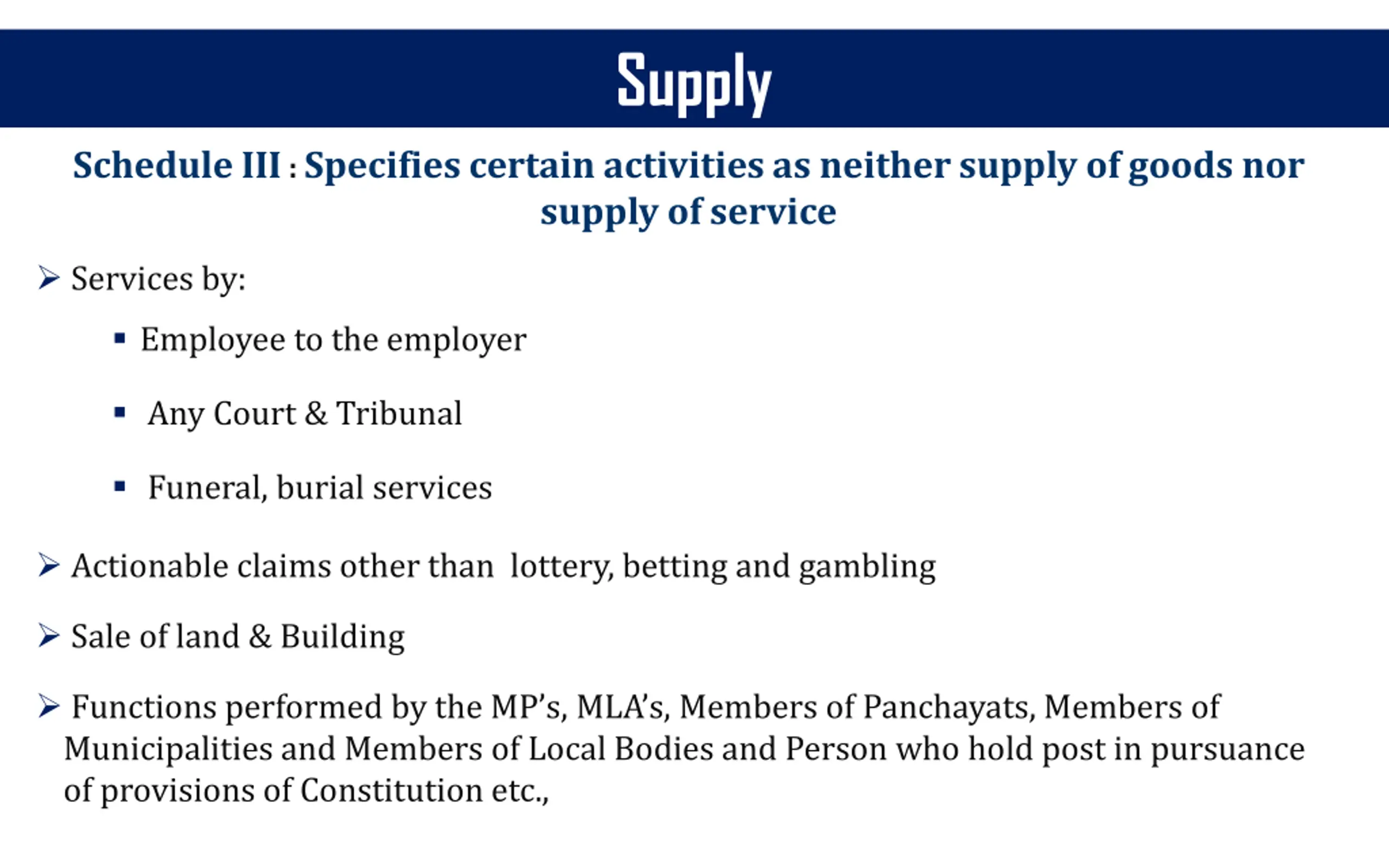 Supply Schedule III : Specifies certain activities as neither supply of goods nor supply of service Services by: Employee to the employer Any Court & Tribunal Funeral, burial services Actionable claims other than lottery, betting and gambling Sale of land & Building Functions performed by the MP s, MLA s, Members of Panchayats, Members of Municipalities and Members of Local Bodies and Person who hold post in pursuance of provisions of Constitution etc.,