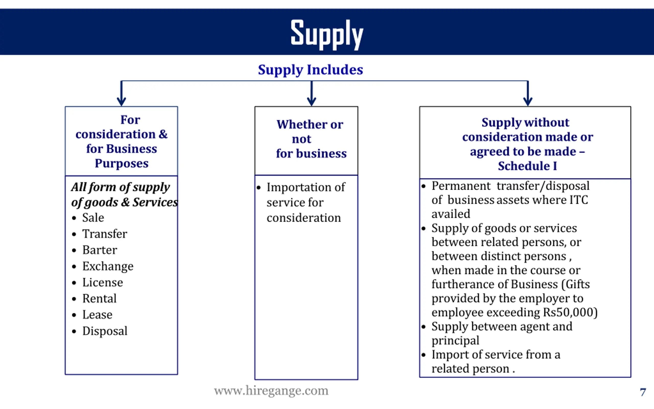 Supply Supply Includes For Supplywithout consideration made or agreed to be made Schedule I Permanent transfer/disposal of businessassets where ITC availed Supply of goods or services between related persons, or between distinct persons , when made in the course or furtherance of Business (Gifts provided by the employer to employee exceeding Rs50,000) Supply between agent and principal Import of service from a related person . Whether or not for business consideration & for Business Purposes All form of supply of goods & Services Sale Transfer Barter Exchange License Rental Lease Disposal Importation of service for consideration www.hiregange.com 7