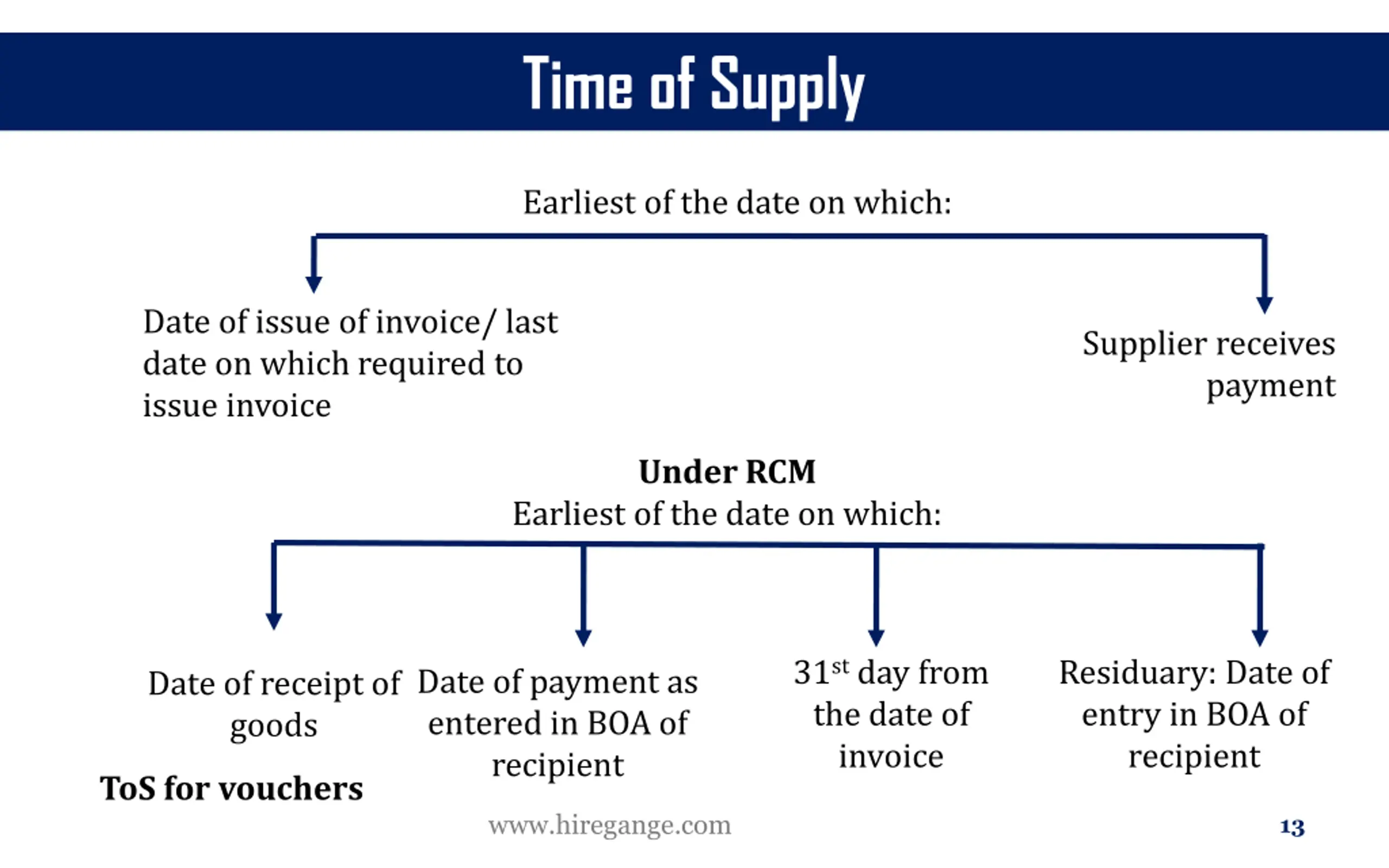 Time of Supply Earliest of the date on which: Date of issue of invoice/ last date on which required to issue invoice Supplier receives payment Under RCM Earliest of the date on which: 31st day from the date of invoice Residuary: Date of entry in BOA of recipient Date of payment as entered in BOA of recipient Date of receipt of goods ToS for vouchers www.hiregange.com 13