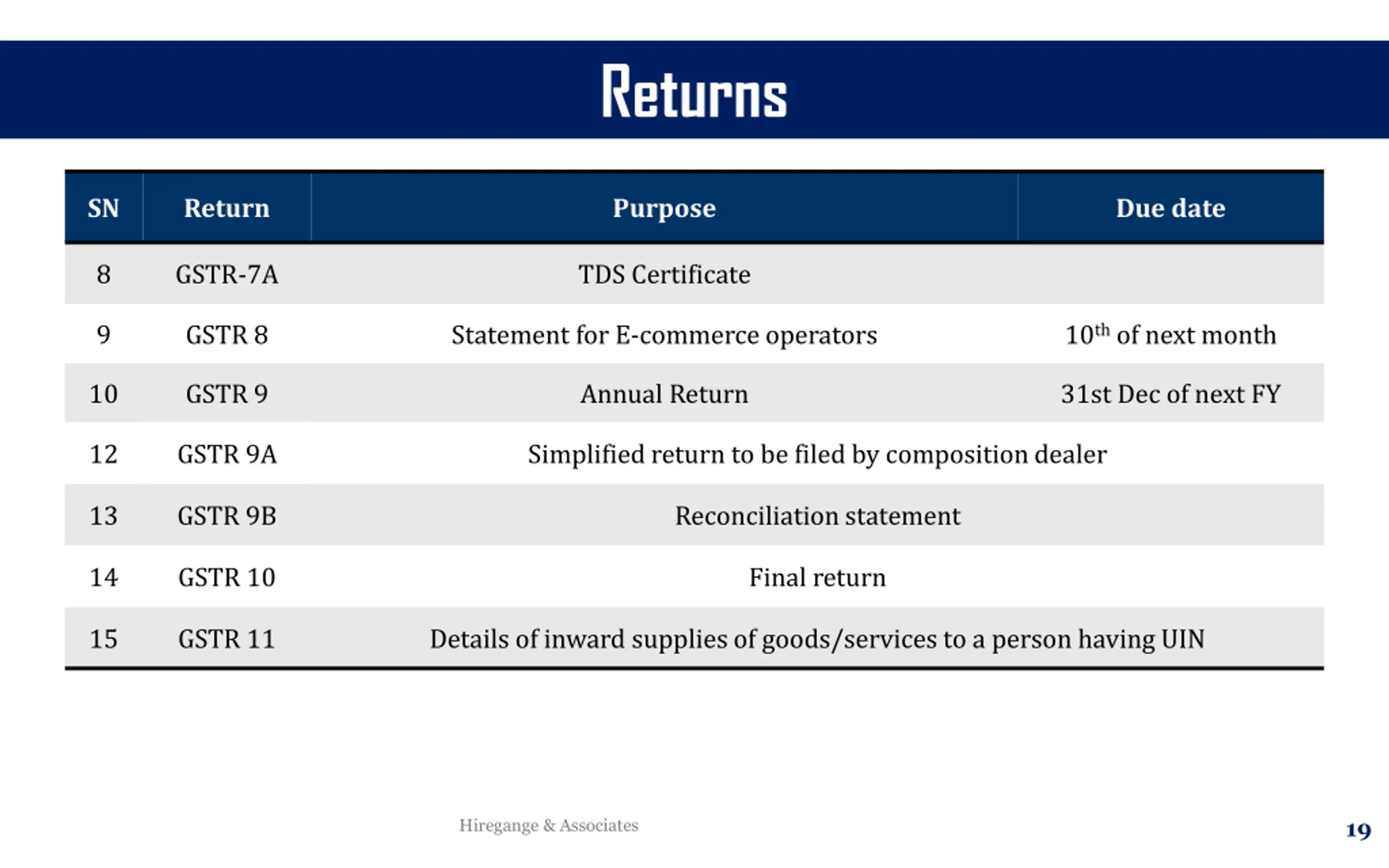 Types of Returns Returns SN Return Purpose Due date 8 GSTR-7A TDS Certificate 9 GSTR 8 Statement for E-commerce operators 10th of next month 10 GSTR 9 Annual Return 31st Dec of next FY 12 GSTR 9A Simplified return to be filed by composition dealer 13 GSTR 9B Reconciliation statement 14 GSTR 10 Final return 15 GSTR 11 Details of inward supplies of goods/services to a person having UIN 19 Hiregange & Associates