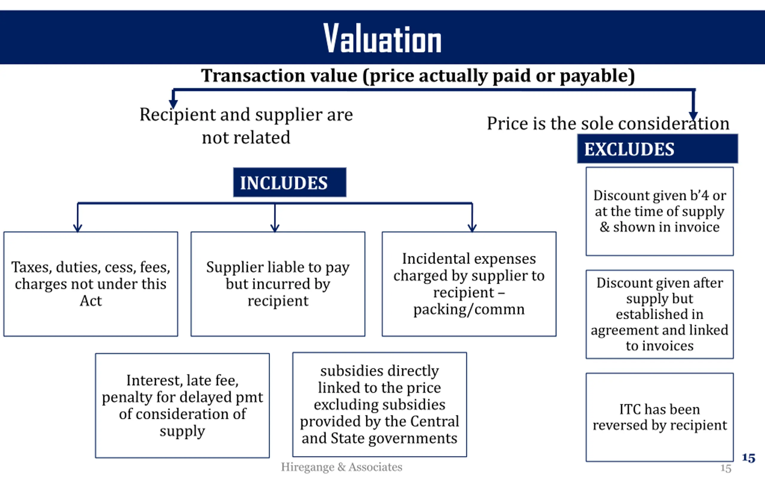 Valuation Transaction value (price actually paid or payable) Recipient and supplier are not related Price is the sole consideration EXCLUDES INCLUDES Discount given b 4 or at the time of supply & shown in invoice Incidental expenses charged by supplier to recipient packing/commn Taxes, duties, cess, fees, charges not under this Act Supplier liable to pay but incurred by recipient Discount given after supply but established in agreement and linked to invoices subsidies directly linked to the price excluding subsidies provided by the Central and State governments Interest, late fee, penalty for delayed pmt of consideration of supply ITC has been reversed by recipient 15 Hiregange & Associates 15