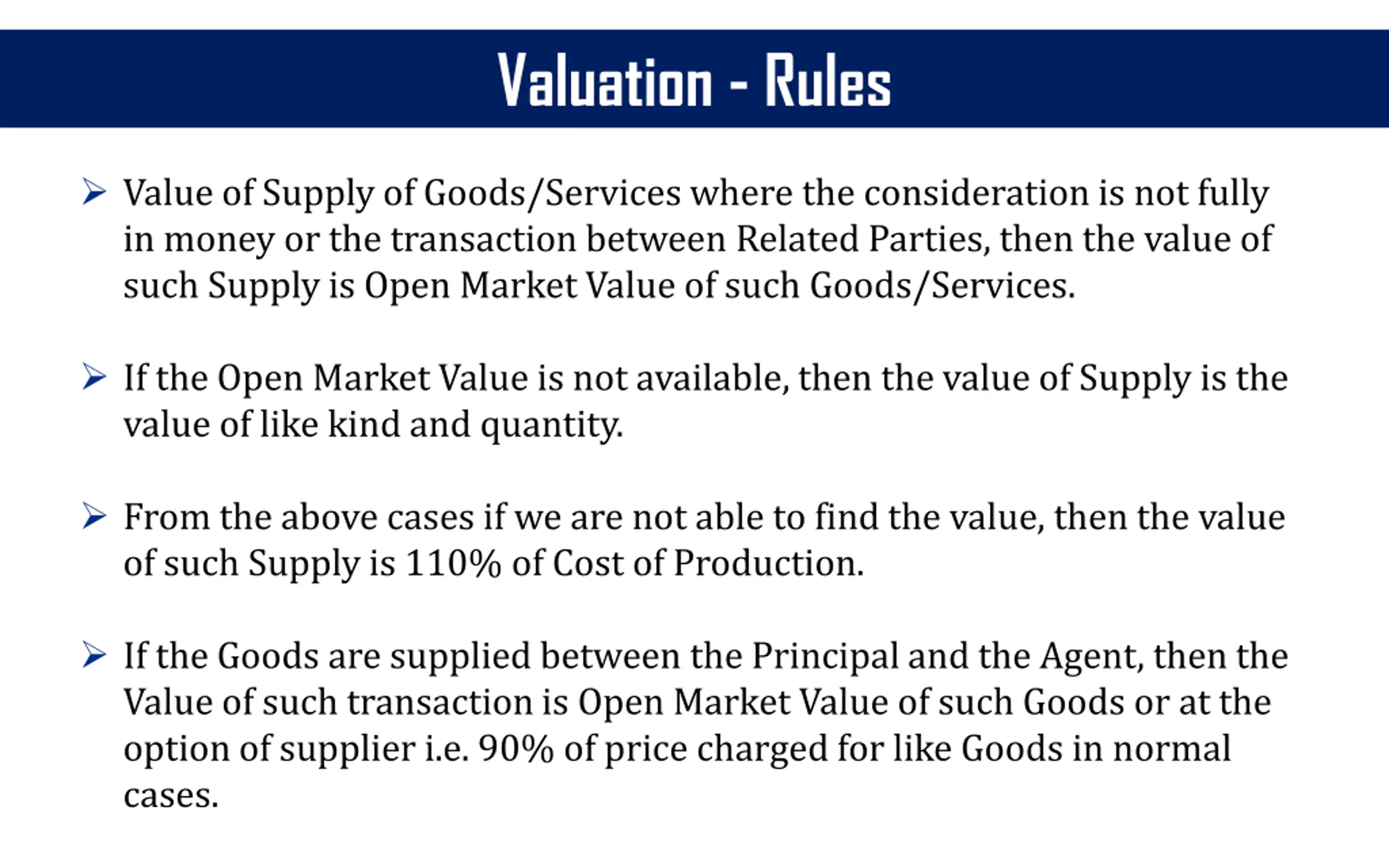 Valuation - Rules Value of Supply of Goods/Services where the consideration is not fully in money or the transaction between Related Parties, then the value of such Supply is Open Market Value of such Goods/Services. If the Open Market Value is not available, then the value of Supply is the value of like kind and quantity. From the above cases if we are not able to find the value, then the value of such Supply is 110% of Cost of Production. If the Goods are supplied between the Principal and the Agent, then the Value of such transaction is Open Market Value of such Goods or at the option of supplier i.e. 90% of price charged for like Goods in normal cases.
