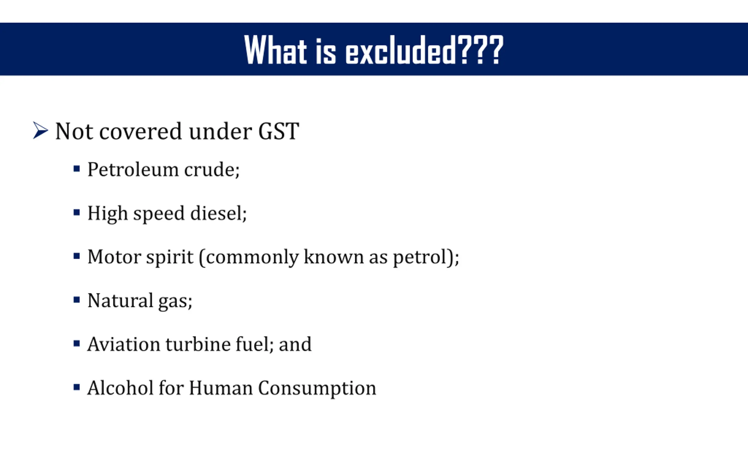 What is excluded??? Not covered under GST Petroleum crude; High speed diesel; Motor spirit (commonly known as petrol); Natural gas; Aviation turbine fuel; and Alcohol for Human Consumption