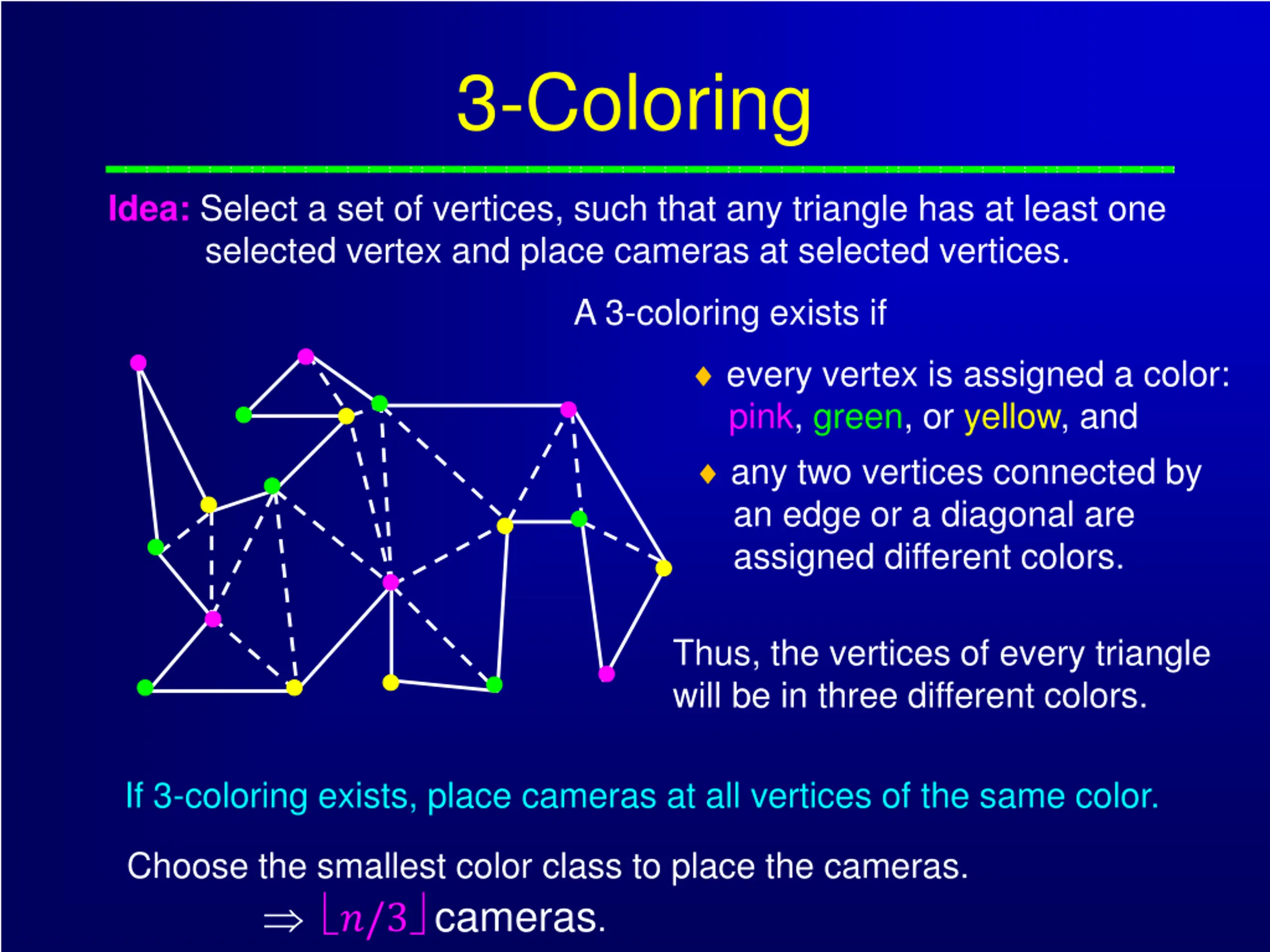 3-Coloring Idea: Select a set of vertices, such that any triangle has at least one selected vertex and place cameras at selected vertices. A 3-coloring exists if every vertex is assigned a color: pink, green, or yellow, and any two vertices connected by an edge or a diagonal are assigned different colors. Thus, the vertices of every triangle will be in three different colors. If 3-coloring exists, place cameras at all vertices of the same color. Choose the smallest color class to place the cameras. ?/3 cameras.