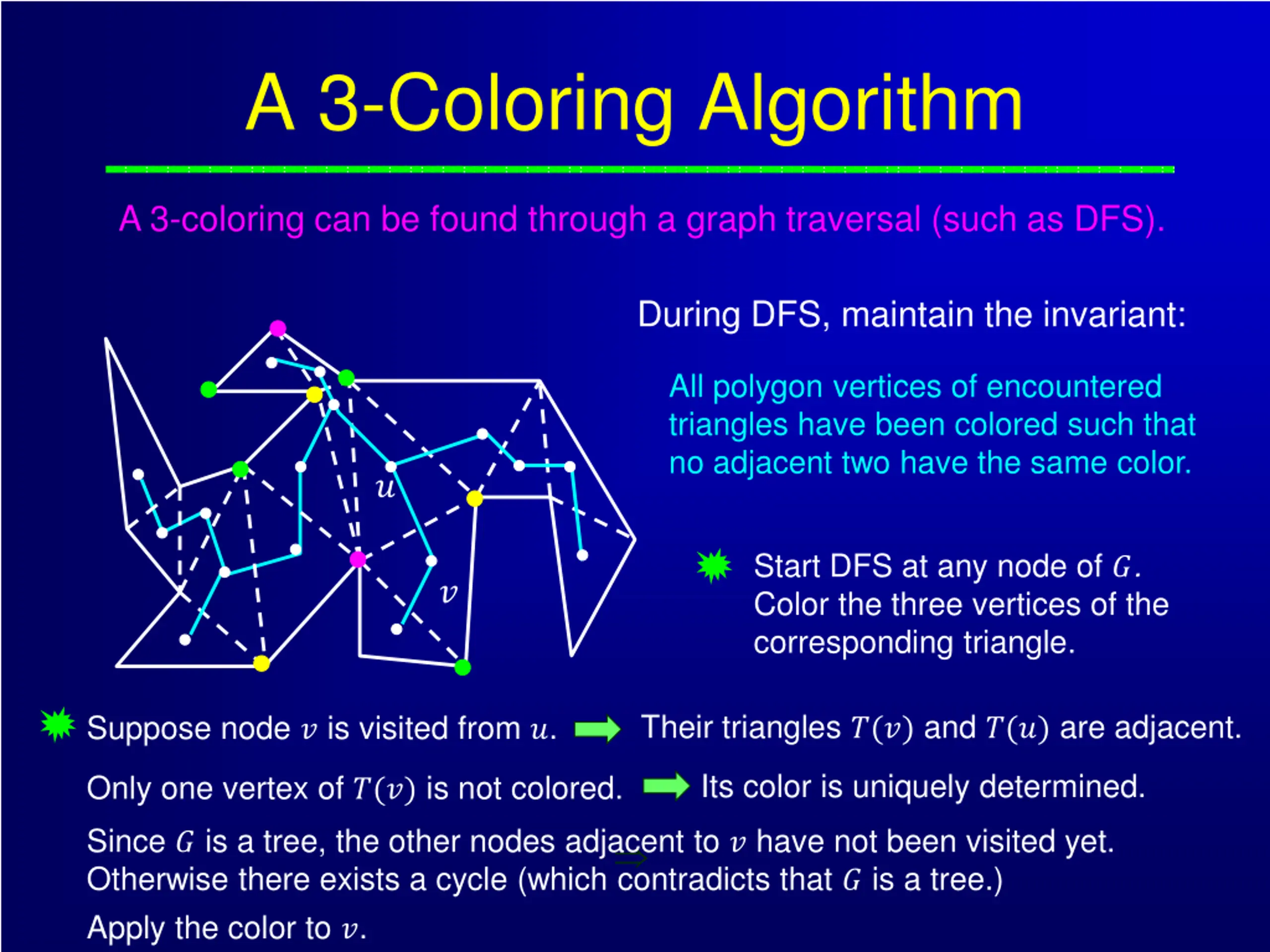 A 3-Coloring Algorithm A 3-coloring can be found through a graph traversal (such as DFS). During DFS, maintain the invariant: All polygon vertices of encountered triangles have been colored such that no adjacent two have the same color. ? Start DFS at any node of ?. Color the three vertices of the corresponding triangle. ? Suppose node ? is visited from ?. Their triangles ?(?) and ?(?) are adjacent. Its color is uniquely determined. Only one vertex of?(?) is not colored. Since ? is a tree, the other nodes adjacent to ? have not been visited yet. Otherwise there exists a cycle (which contradicts that ? is a tree.) Apply the color to ?.
