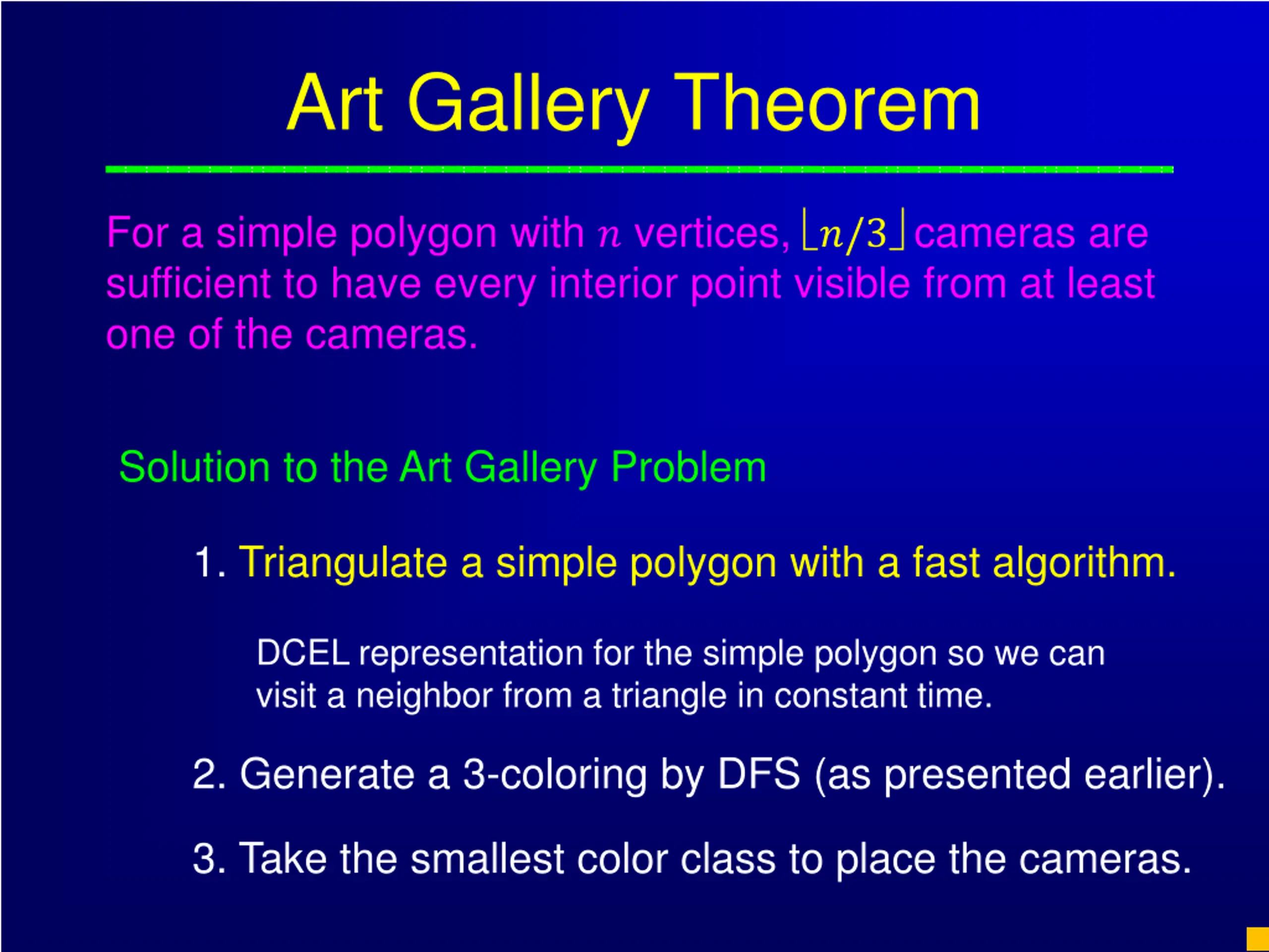 Art Gallery Theorem For a simple polygon with ? vertices, ?/3 cameras are sufficient to have every interior point visible from at least one of the cameras. Solution to the Art Gallery Problem 1. Triangulate a simple polygon with a fast algorithm. DCEL representation for the simple polygon so we can visit a neighbor from a triangle in constant time. 2. Generate a 3-coloring by DFS (as presented earlier). 3. Take the smallest color class to place the cameras.