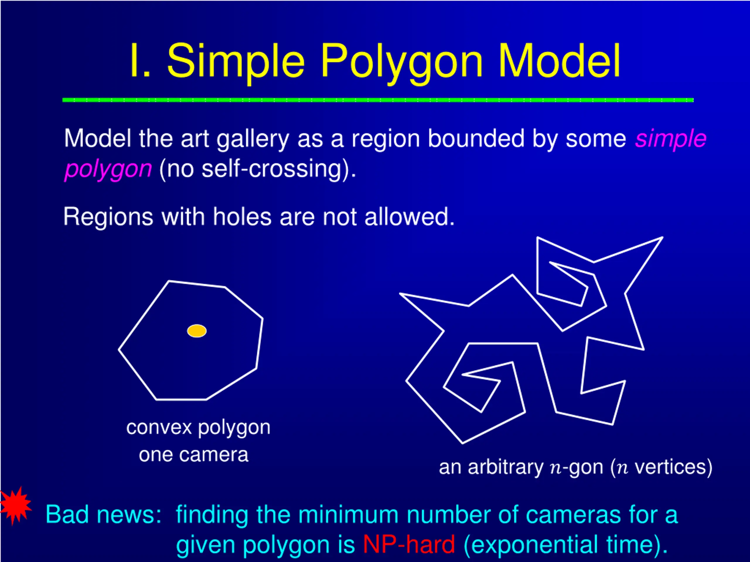 I. Simple Polygon Model Model the art gallery as a region bounded by some simple polygon (no self-crossing). Regions with holes are not allowed. convex polygon one camera an arbitrary ?-gon (? vertices) Bad news: finding the minimum number of cameras for a given polygon is NP-hard (exponential time).