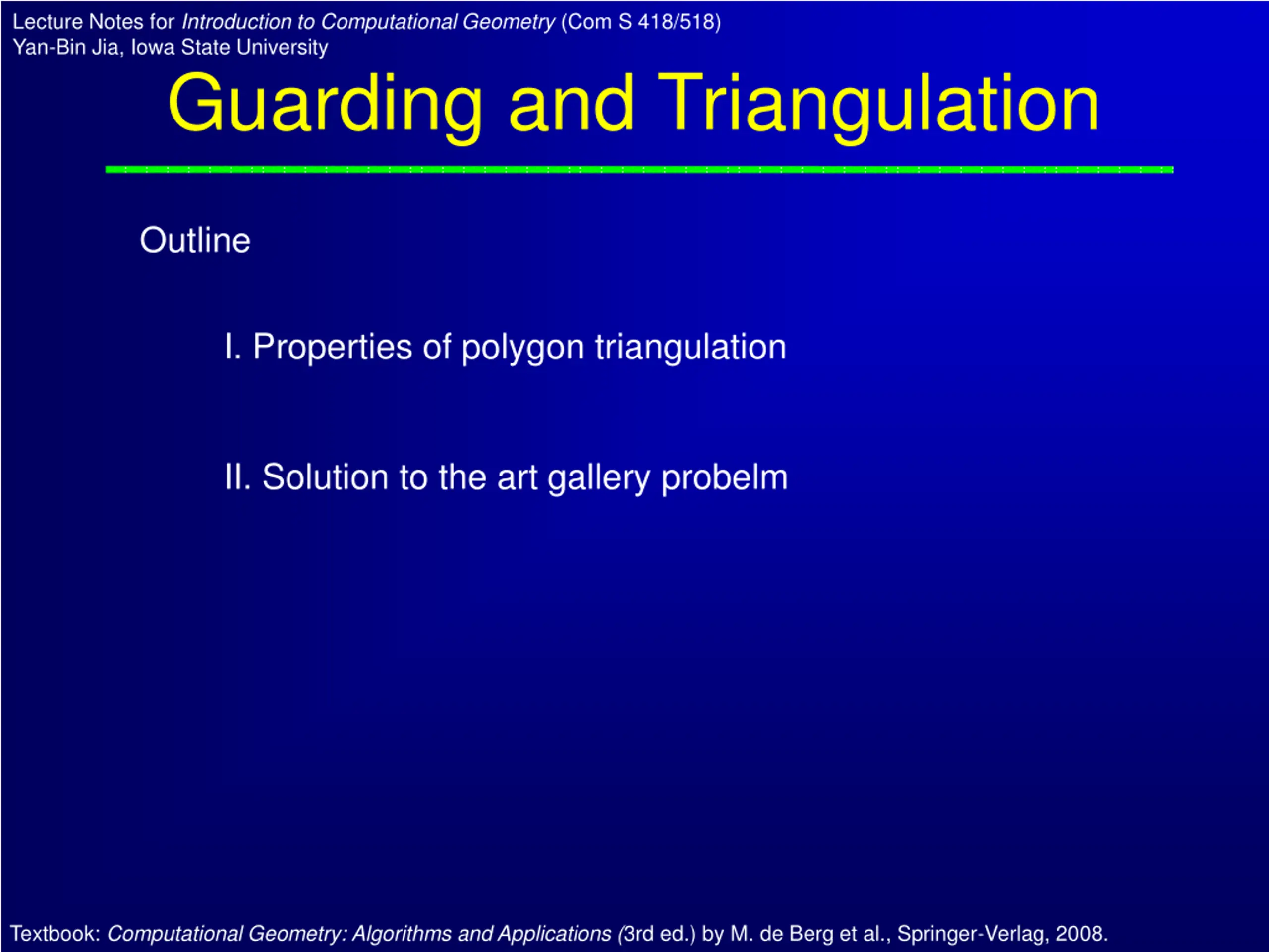 Lecture Notes for Introduction to Computational Geometry (Com S 418/518) Yan-Bin Jia, Iowa State University Guarding and Triangulation Outline I. Properties of polygon triangulation II. Solution to the art gallery probelm Textbook: Computational Geometry: Algorithms and Applications (3rd ed.) by M. de Berg et al., Springer-Verlag, 2008.