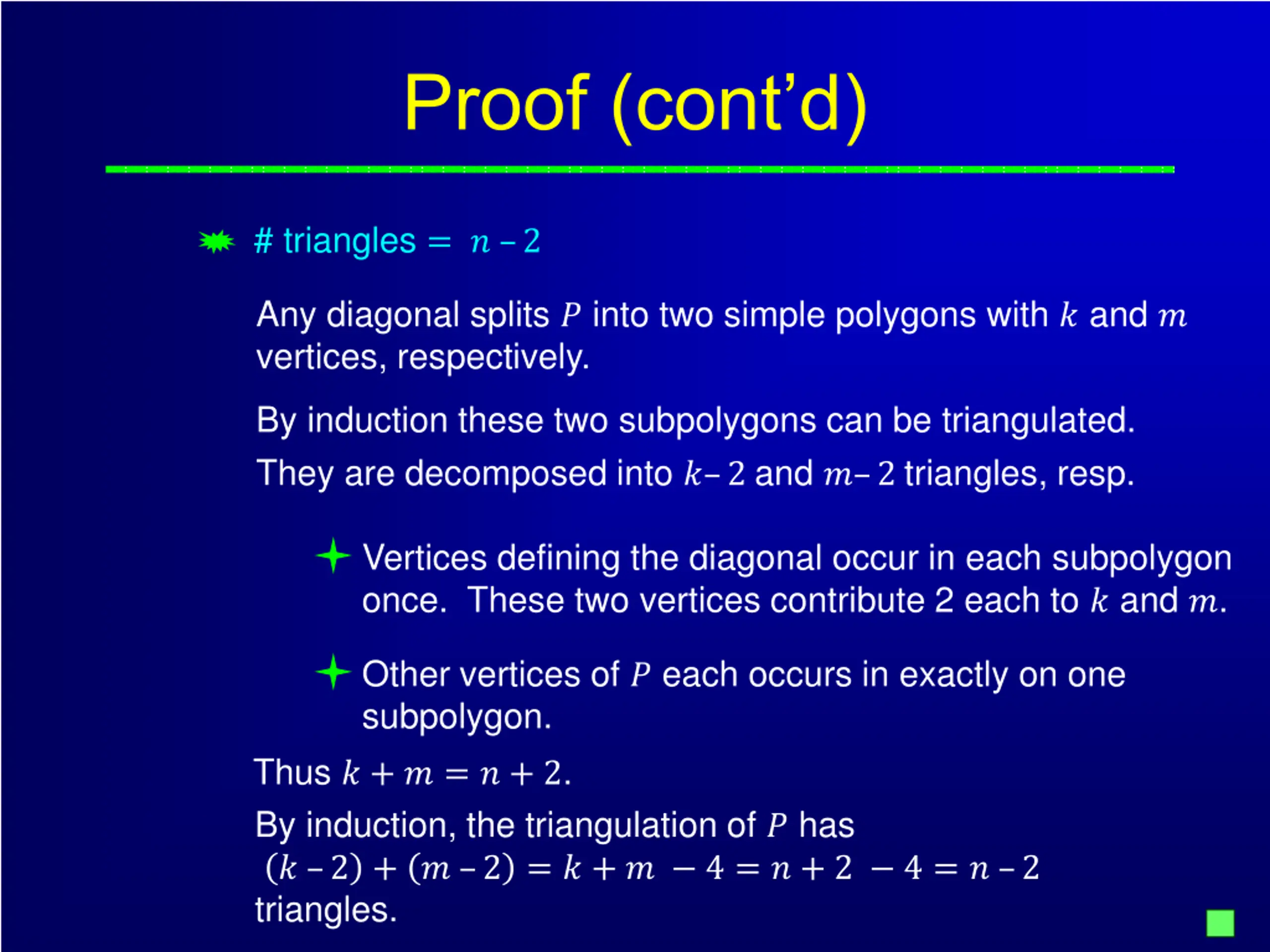 Proof (contd) # triangles = ? 2 Any diagonal splits ? into two simple polygons with ? and ? vertices, respectively. By induction these two subpolygons can be triangulated. They are decomposed into ? 2 and ? 2 triangles, resp. Vertices defining the diagonal occur in each subpolygon once. These two vertices contribute 2 each to ? and ?. Other vertices of ? each occurs in exactly on one subpolygon. Thus ? + ? = ? + 2. By induction, the triangulation of ? has ? 2 + ? 2 = ? + ? 4 = ? + 2 4 = ? 2 triangles.