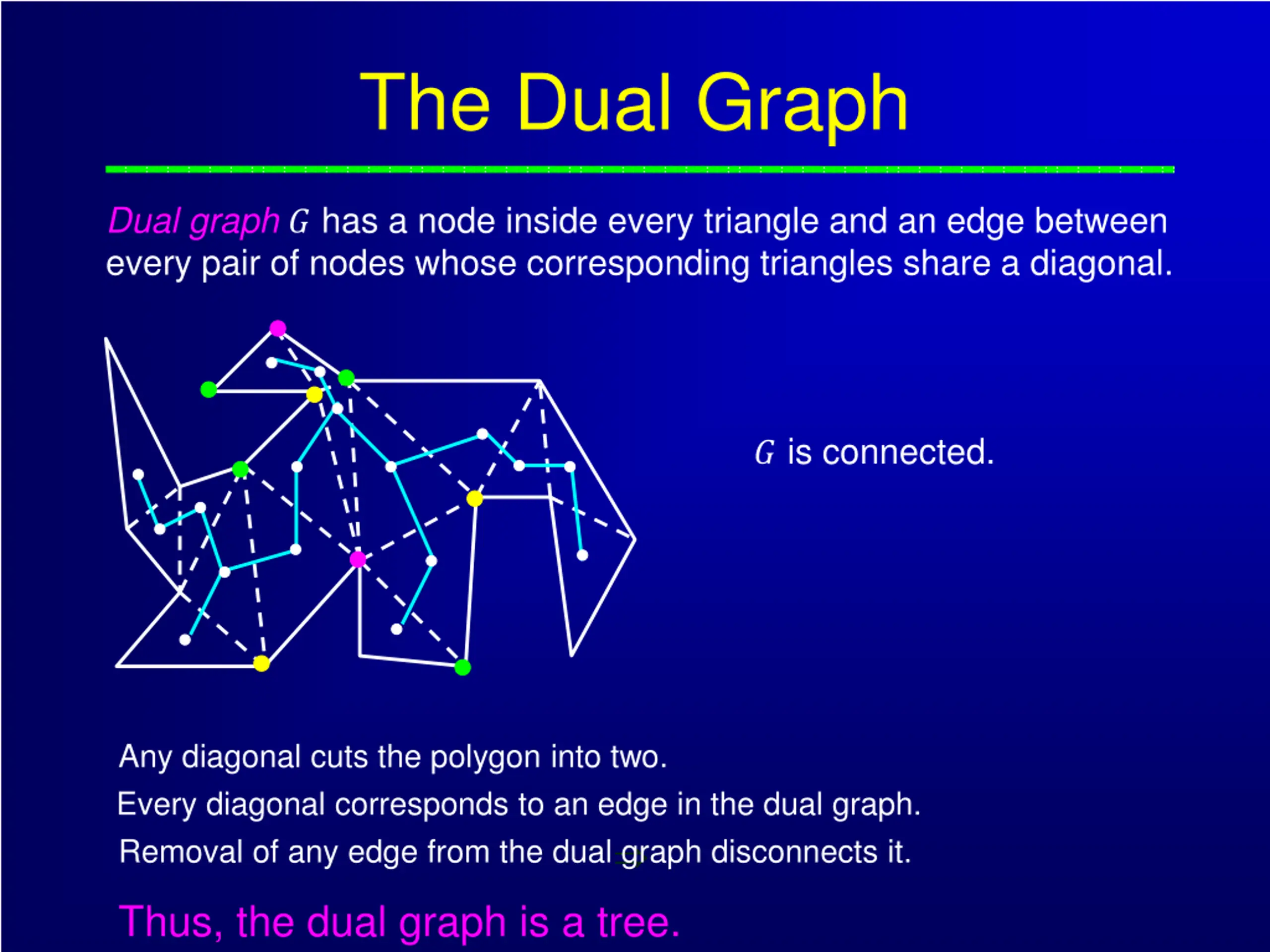 The Dual Graph Dual graph? has a node inside every triangle and an edge between every pair of nodes whose corresponding triangles share a diagonal. ? is connected. Any diagonal cuts the polygon into two. Every diagonal corresponds to an edge in the dual graph. Removal of any edge from the dual graph disconnects it. Thus, the dual graph is a tree.