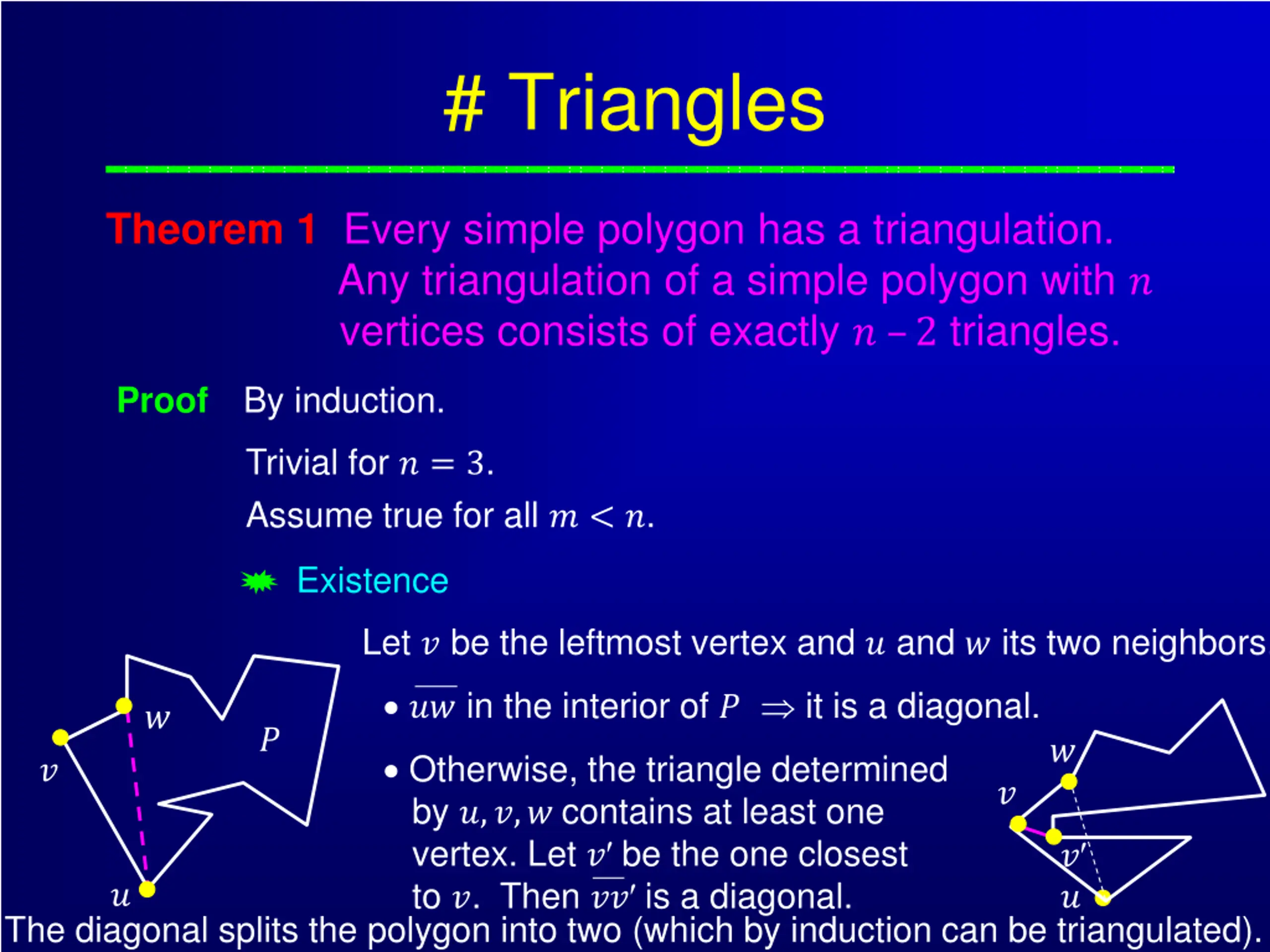 # Triangles Theorem 1 Every simple polygon has a triangulation. Any triangulation of a simple polygon with ? vertices consists of exactly ? 2 triangles. By induction. Proof Trivial for? = 3. Assume true for all ? < ?. Existence Let ? be the leftmost vertex and ? and ? its two neighbors. ?? in the interior of ? it is a diagonal. ? ? ? Otherwise, the triangle determined by ?,?,? contains at least one vertex. Let ? be the one closest to ?. Then ?? is a diagonal. ? ? ? ? ? The diagonal splits the polygon into two (which by induction can be triangulated).