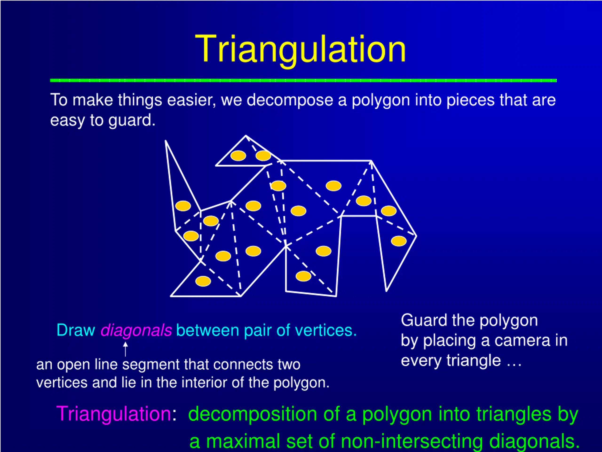 Triangulation To make things easier, we decompose a polygon into pieces that are easy to guard. Guard the polygon by placing a camera in every triangle Draw diagonals between pair of vertices. an open line segment that connects two vertices and lie in the interior of the polygon. Triangulation: decomposition of a polygon into triangles by a maximal set of non-intersecting diagonals.