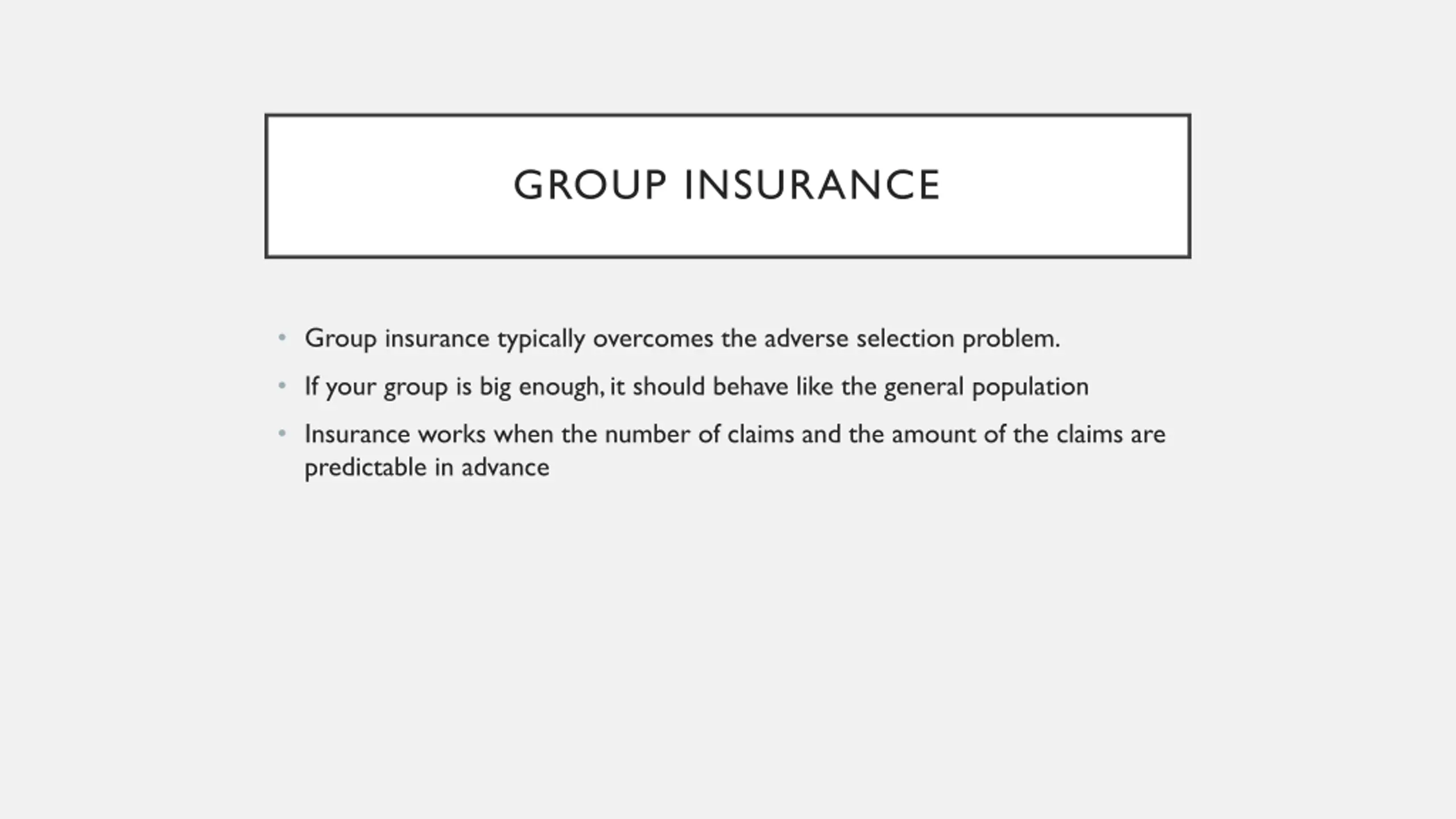 GROUP INSURANCE Group insurance typically overcomes the adverse selection problem. If your group is big enough, it should behave like the general population Insurance works when the number of claims and the amount of the claims are predictable in advance