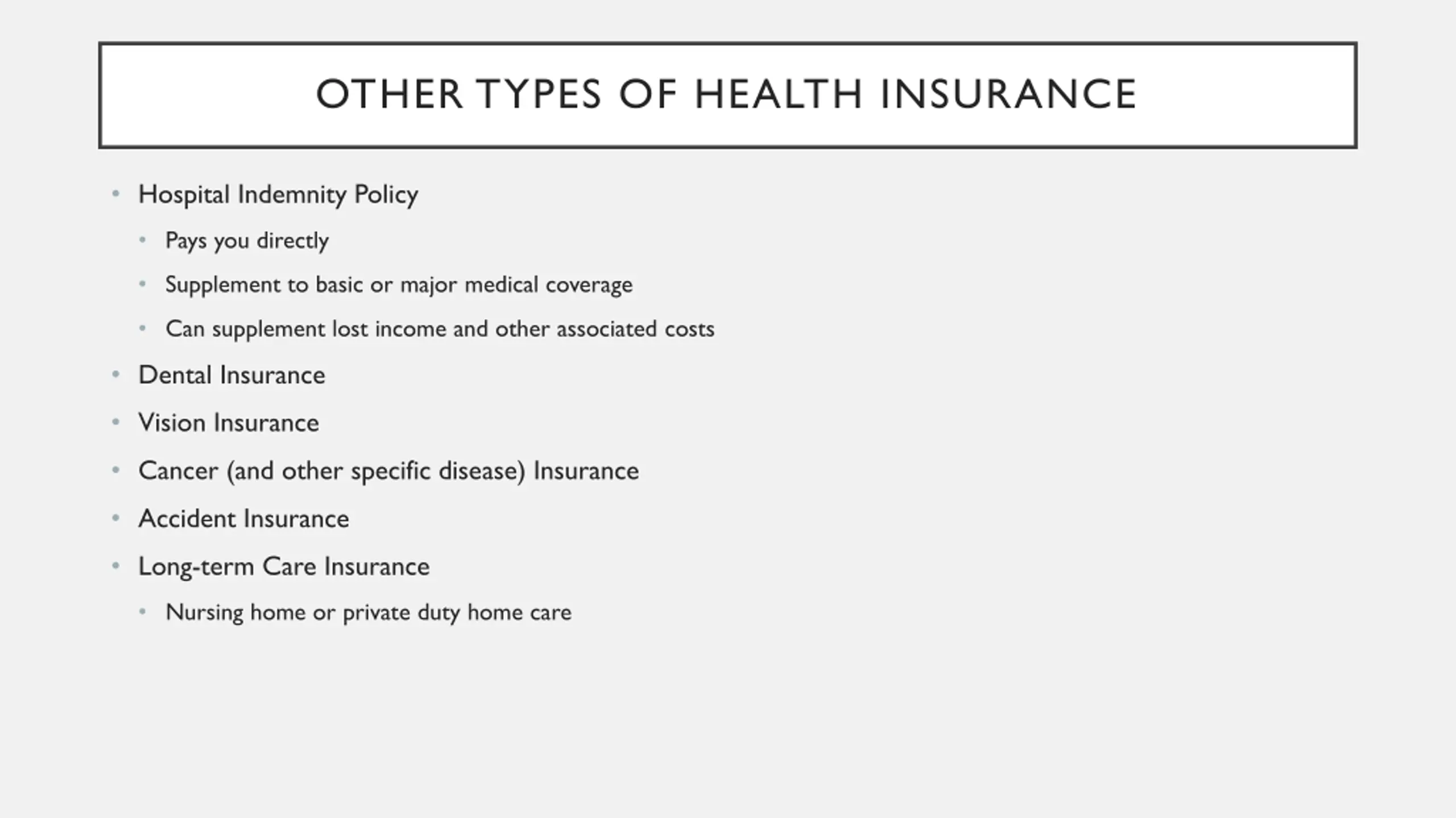 OTHER TYPES OF HEALTH INSURANCE Hospital Indemnity Policy Pays you directly Supplement to basic or major medical coverage Can supplement lost income and other associated costs Dental Insurance Vision Insurance Cancer (and other specific disease) Insurance Accident Insurance Long-term Care Insurance Nursing home or private duty home care