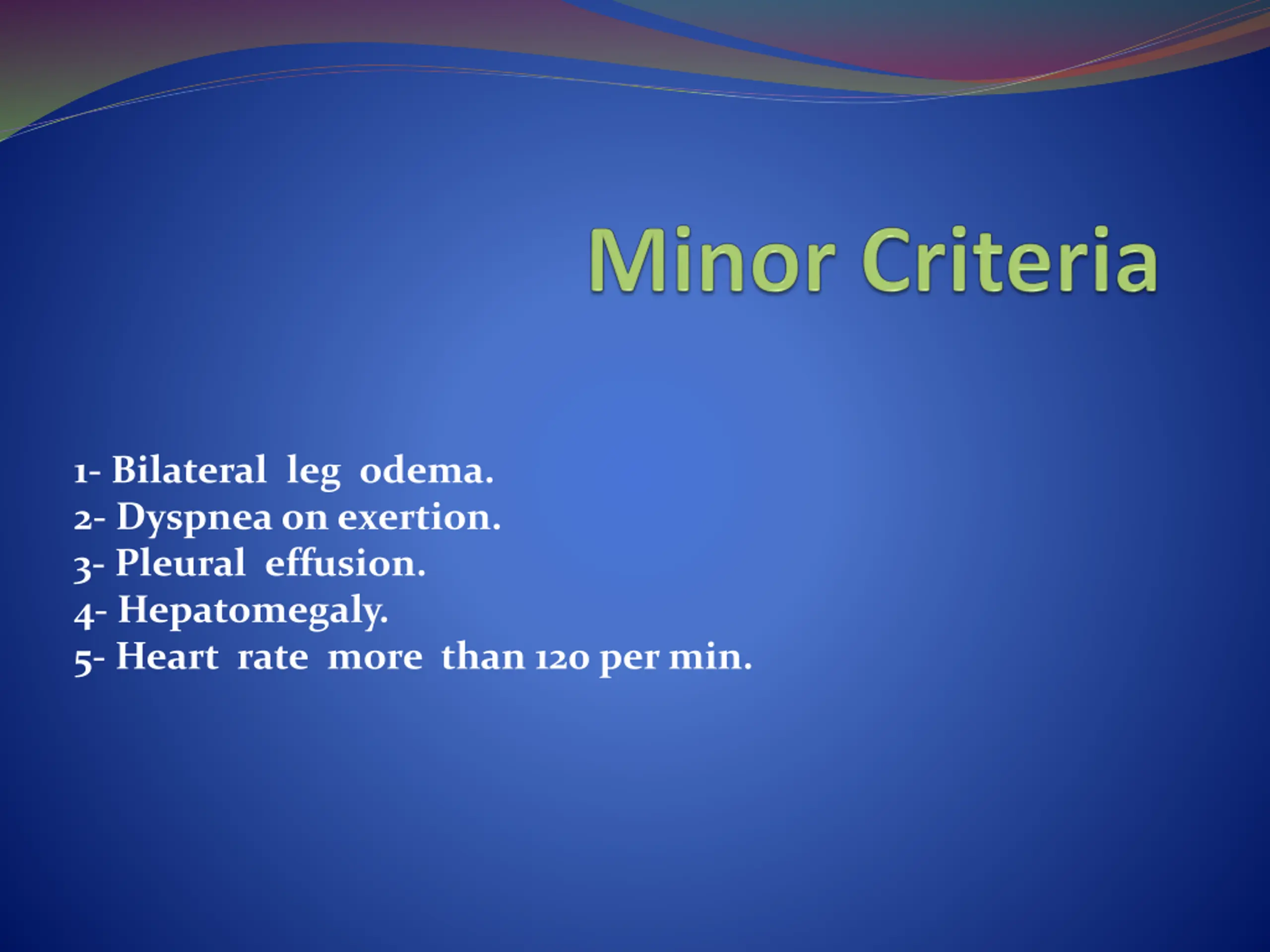 1- Bilateral leg odema. 2- Dyspnea on exertion. 3- Pleural effusion. 4- Hepatomegaly. 5- Heart rate more than 120 per min.