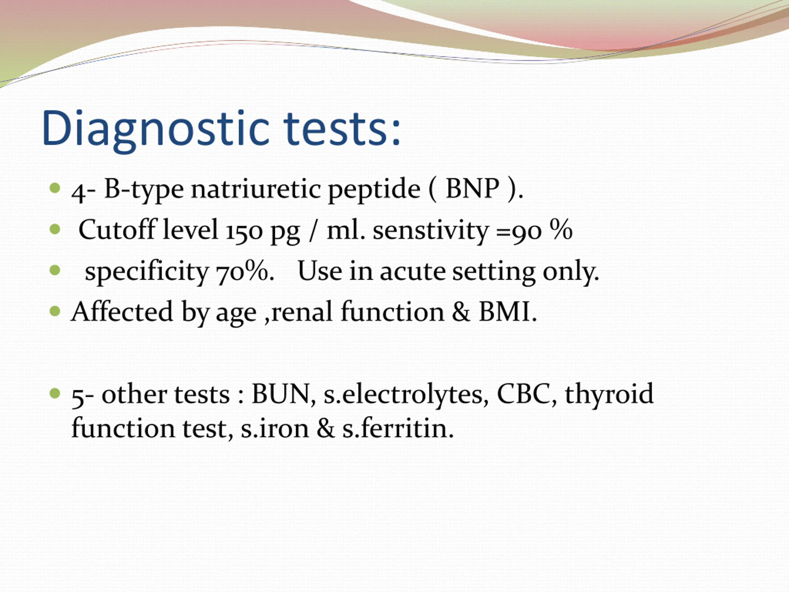 Diagnostic tests: 4- B-type natriuretic peptide ( BNP ). Cutoff level 150 pg / ml. senstivity =90 % specificity 70%. Use in acute setting only. Affected by age ,renal function & BMI. 5- other tests : BUN, s.electrolytes, CBC, thyroid function test, s.iron & s.ferritin.