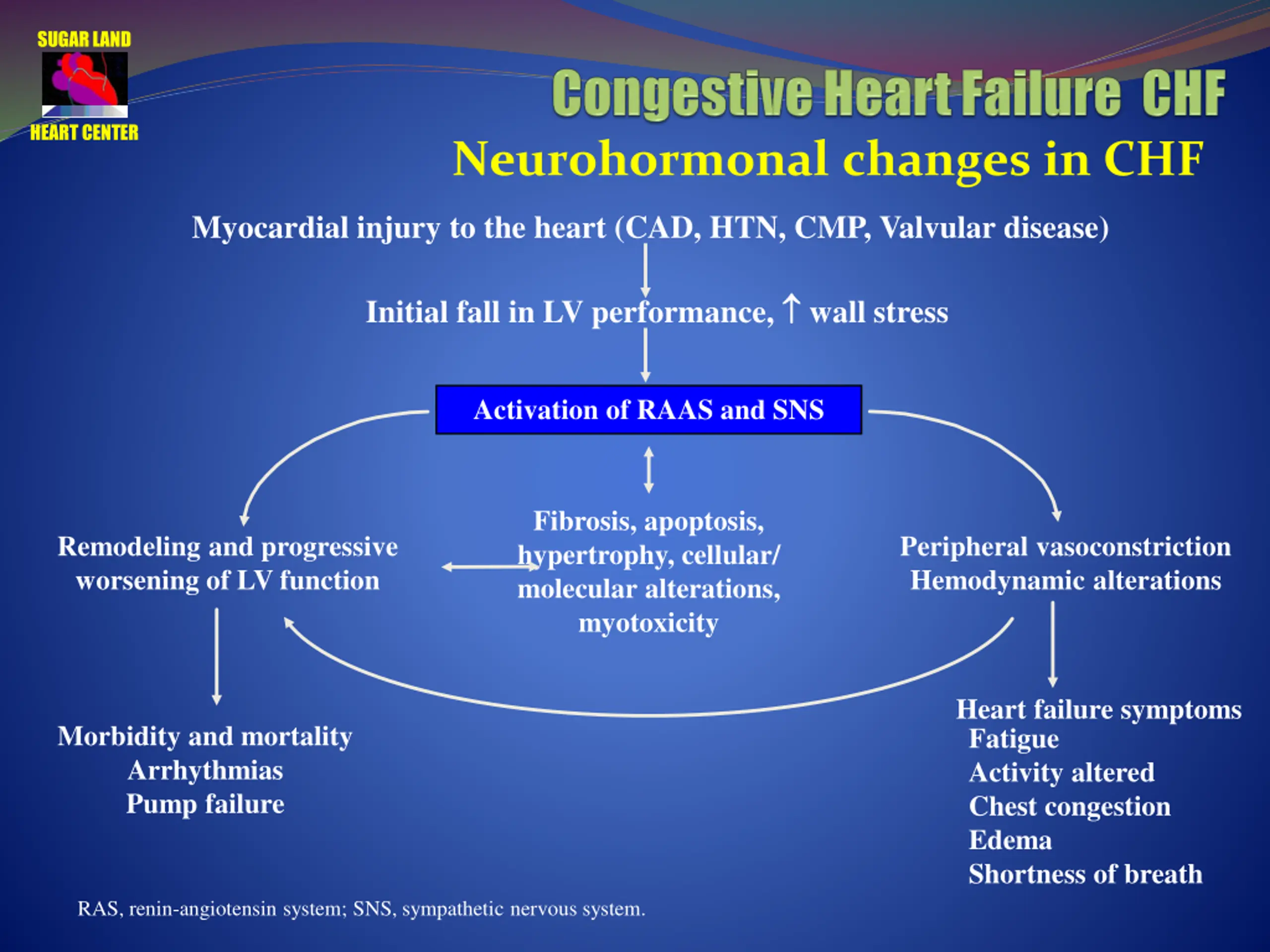 SUGAR LAND HEART CENTER Neurohormonal changes in CHF Myocardial injury to the heart (CAD, HTN, CMP, Valvular disease) Initial fall in LV performance, wall stress Activation of RAAS and SNS Fibrosis, apoptosis, hypertrophy, cellular/ molecular alterations, myotoxicity Remodeling and progressive worsening of LV function Peripheral vasoconstriction Hemodynamic alterations Heart failure symptoms Fatigue Activity altered Chest congestion Edema Shortness of breath Morbidity and mortality Arrhythmias Pump failure RAS, renin-angiotensin system; SNS, sympathetic nervous system.