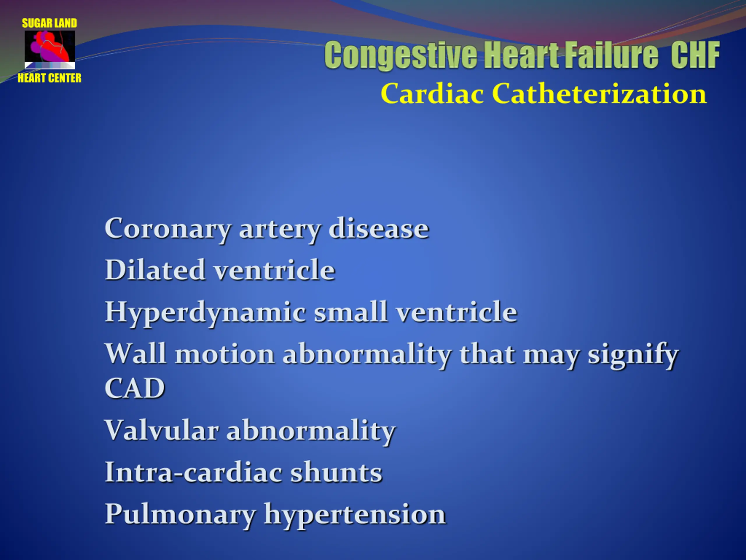 SUGAR LAND HEART CENTER Cardiac Catheterization Coronary artery disease Dilated ventricle Hyperdynamic small ventricle Wall motion abnormality that may signify CAD Valvular abnormality Intra-cardiac shunts Pulmonary hypertension