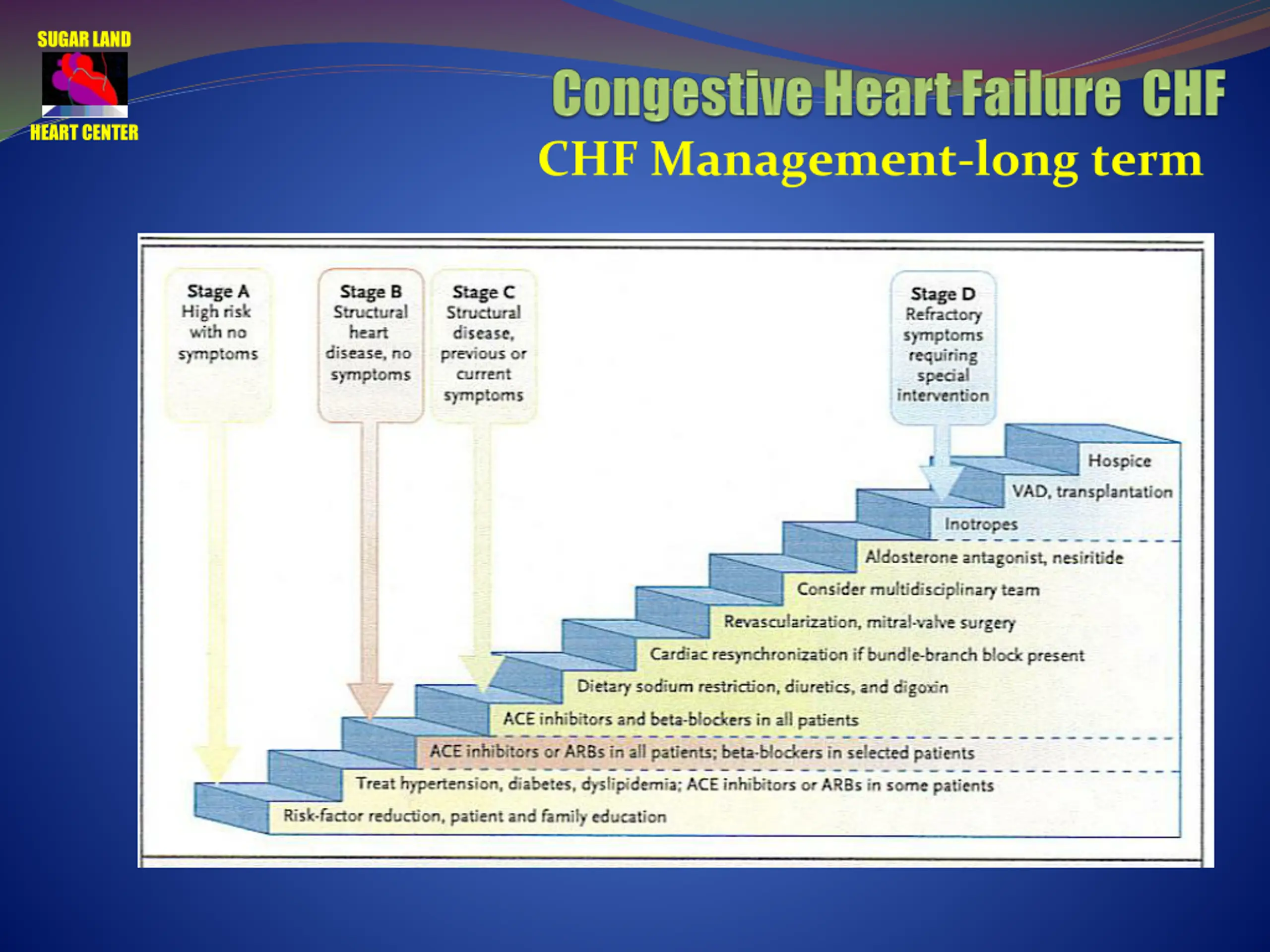 SUGAR LAND HEART CENTER Goals for CHF management in a hospital 1. Relieve symptoms rapidly 2. Reverse hemodynamic abnormalities 3. Prevent end-organ dysfunction 4. Initiate patient education and survival-enhancing medications before discharge 5. Optimize survival-enhancing oral medications (ACE inhibitor, beta blocker, aldosterone receptor antagonist) 6. Optimize patient education and HF disease management
