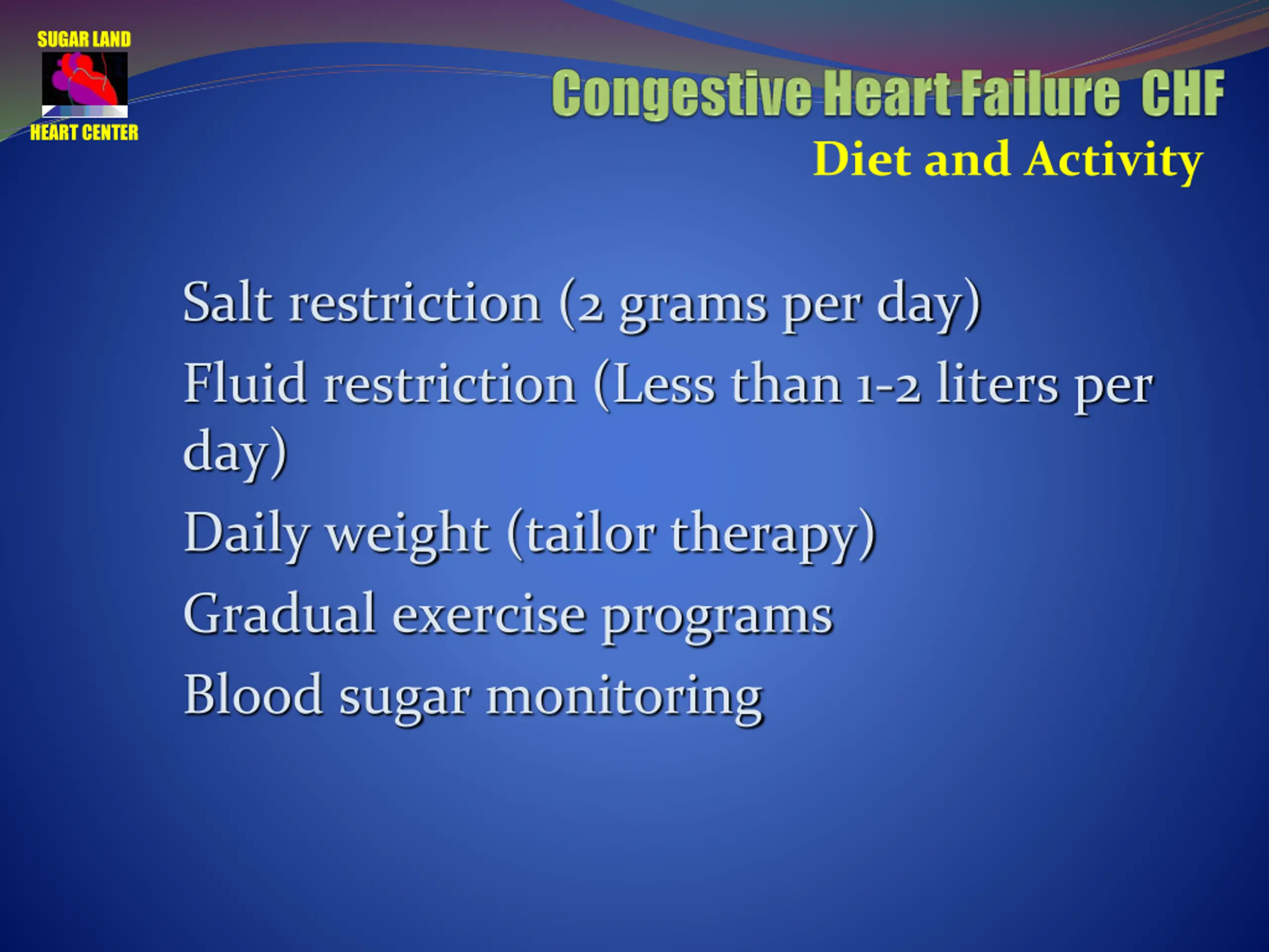 SUGAR LAND HEART CENTER Diet and Activity Salt restriction (2 grams per day) Fluid restriction (Less than 1-2 liters per day) Daily weight (tailor therapy) Gradual exercise programs Blood sugar monitoring