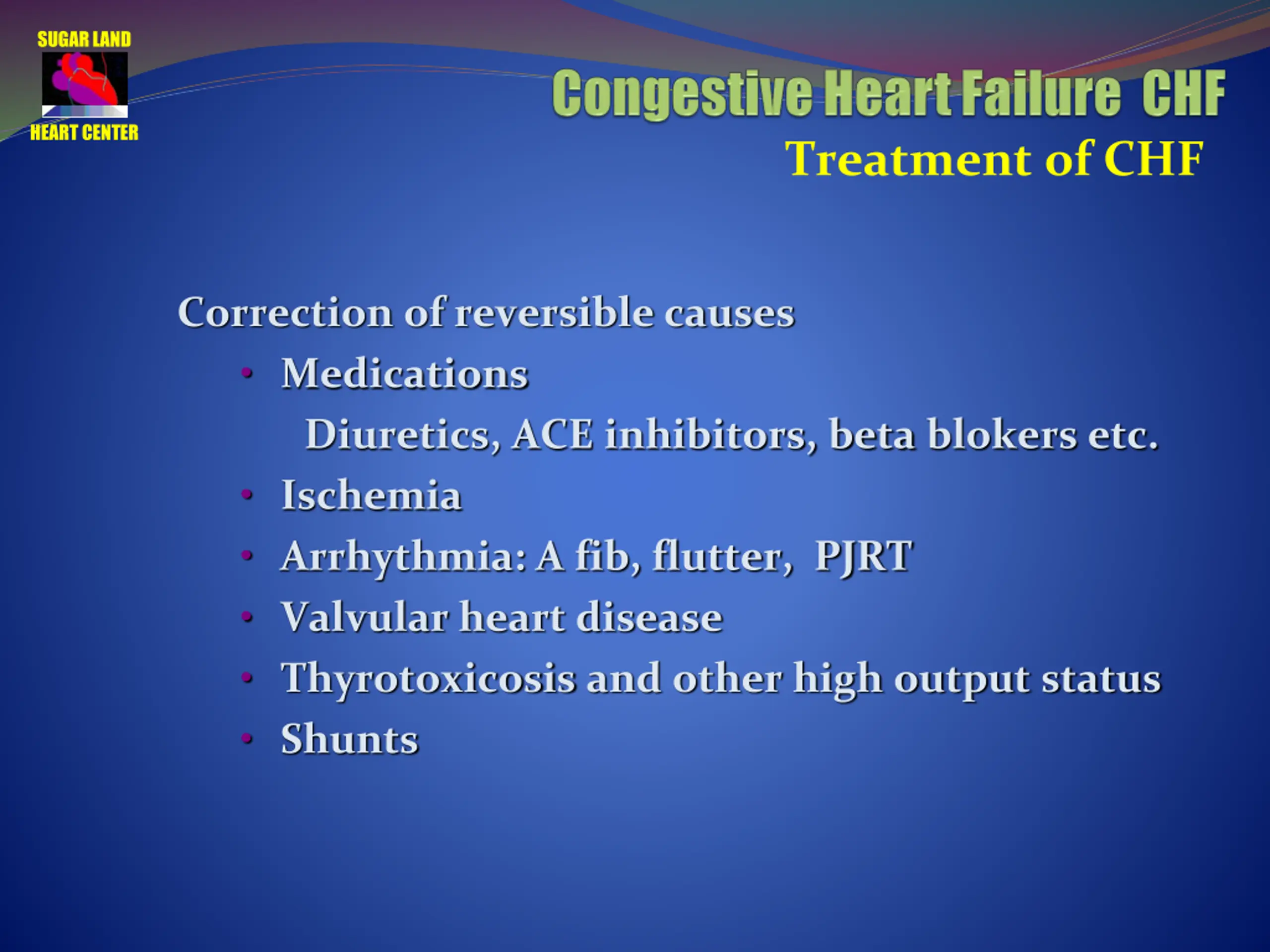 SUGAR LAND HEART CENTER Treatment of CHF Correction of reversible causes Medications Diuretics, ACE inhibitors, beta blokers etc. Ischemia Arrhythmia: A fib, flutter, PJRT Valvular heart disease Thyrotoxicosis and other high output status Shunts