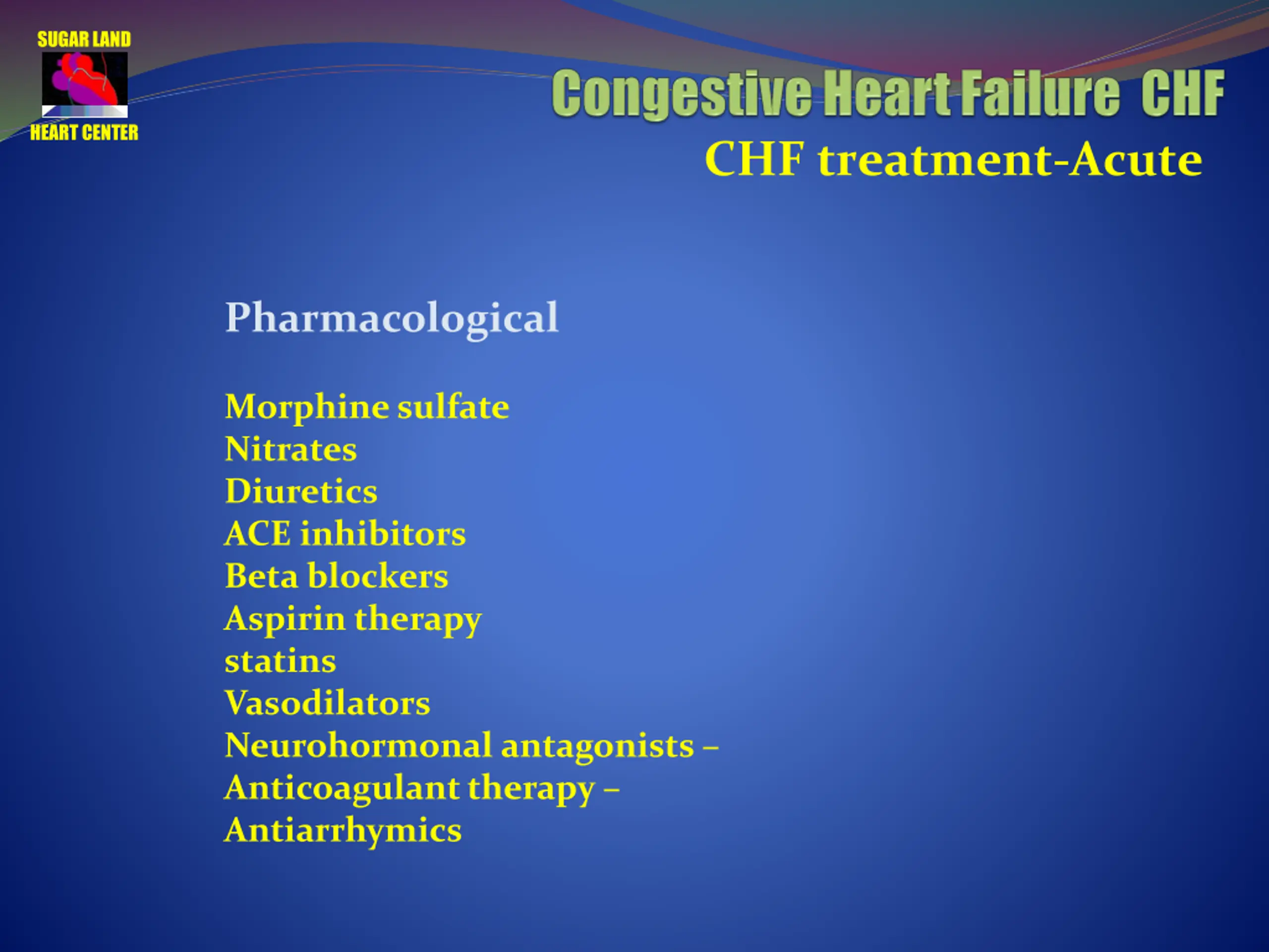 SUGAR LAND HEART CENTER CHF treatment-Acute Pharmacological Morphine sulfate Nitrates Diuretics ACE inhibitors Beta blockers Aspirin therapy statins Vasodilators Neurohormonal antagonists Anticoagulant therapy Antiarrhymics