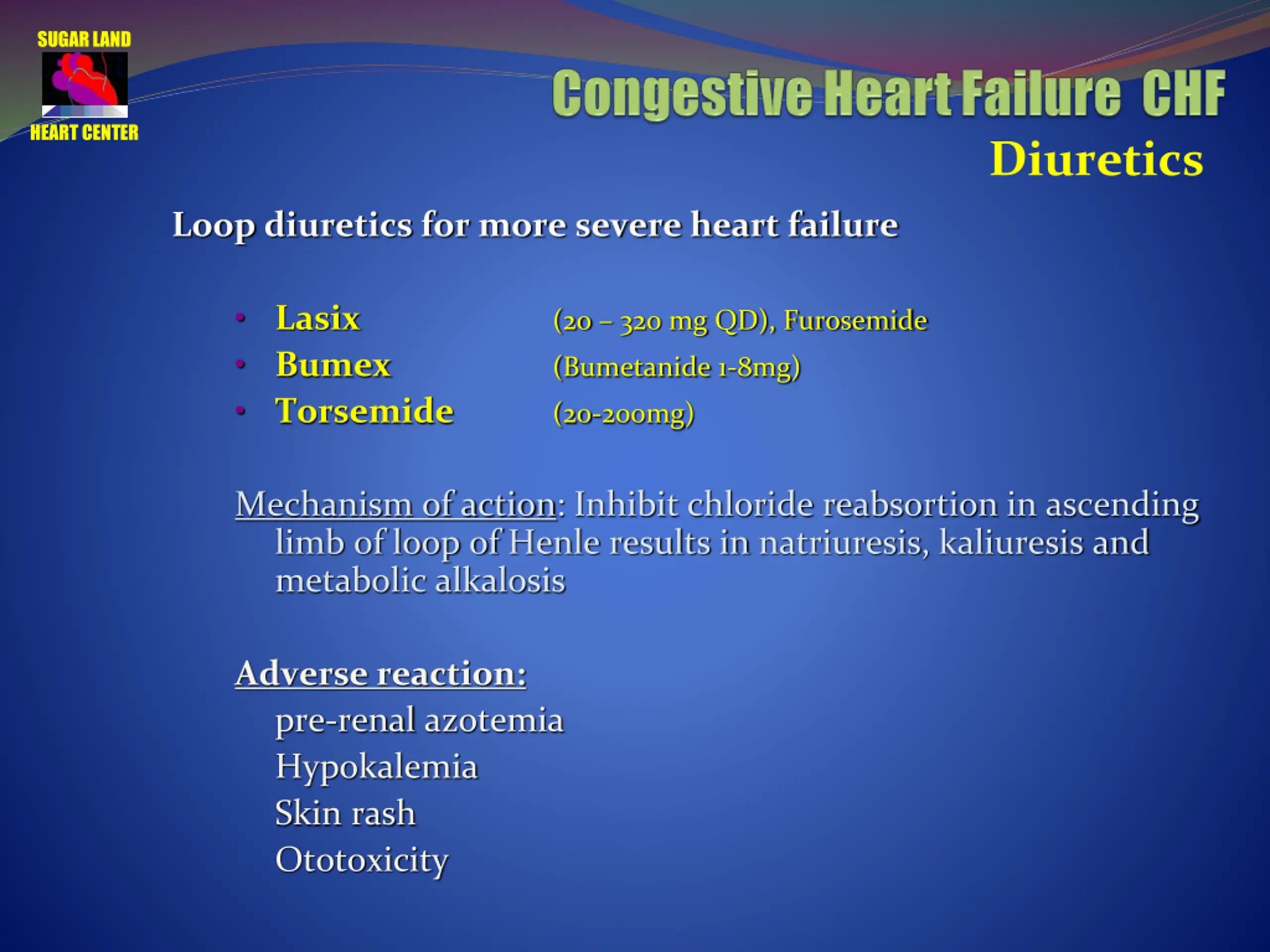 SUGAR LAND HEART CENTER Diuretics Loop diuretics for more severe heart failure Lasix Bumex Torsemide (20 320 mg QD), Furosemide (Bumetanide 1-8mg) (20-200mg) Mechanism of action: Inhibit chloride reabsortion in ascending limb of loop of Henle results in natriuresis, kaliuresis and metabolic alkalosis Adverse reaction: pre-renal azotemia Hypokalemia Skin rash Ototoxicity