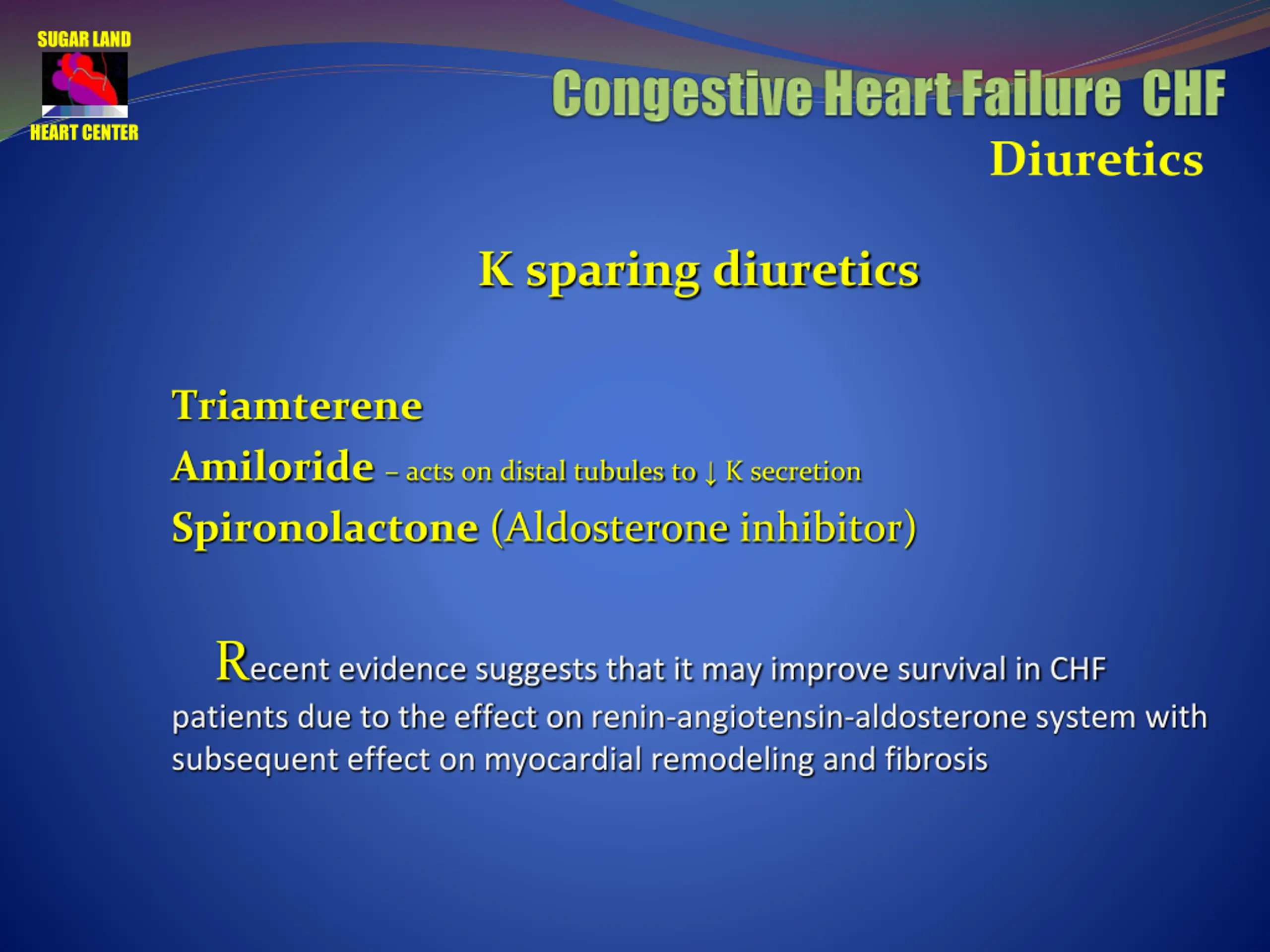 SUGAR LAND HEART CENTER Diuretics K sparing diuretics Triamterene Amiloride acts on distal tubules to K secretion Spironolactone (Aldosterone inhibitor) Recent evidence suggests that it may improve survival in CHF patients due to the effect on renin-angiotensin-aldosterone system with subsequent effect on myocardial remodeling and fibrosis