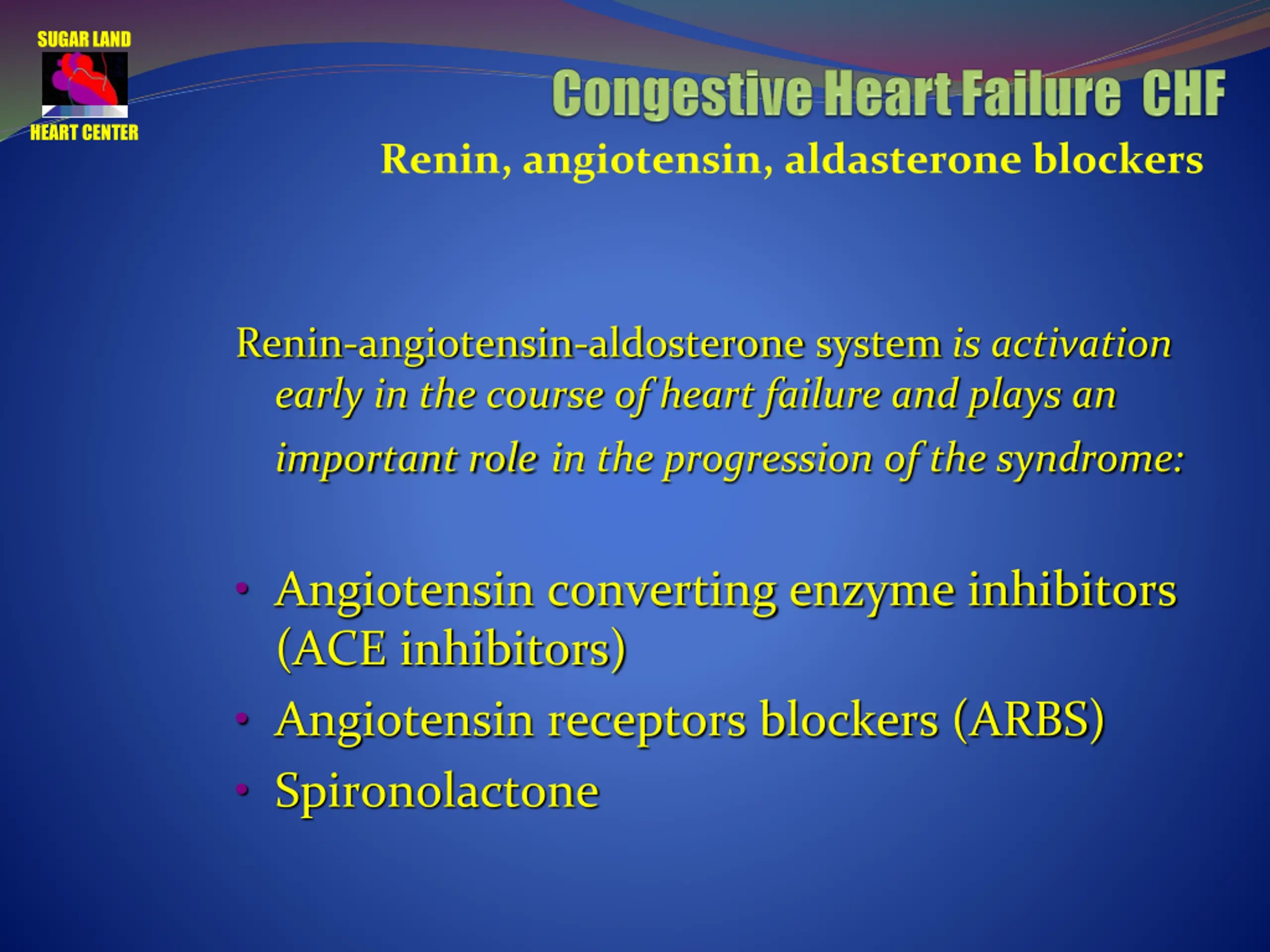 SUGAR LAND HEART CENTER Renin, angiotensin, aldasterone blockers Renin-angiotensin-aldosterone system is activation early in the course of heart failure and plays an important rolein the progression of the syndrome: Angiotensin converting enzyme inhibitors (ACE inhibitors) Angiotensin receptors blockers (ARBS) Spironolactone