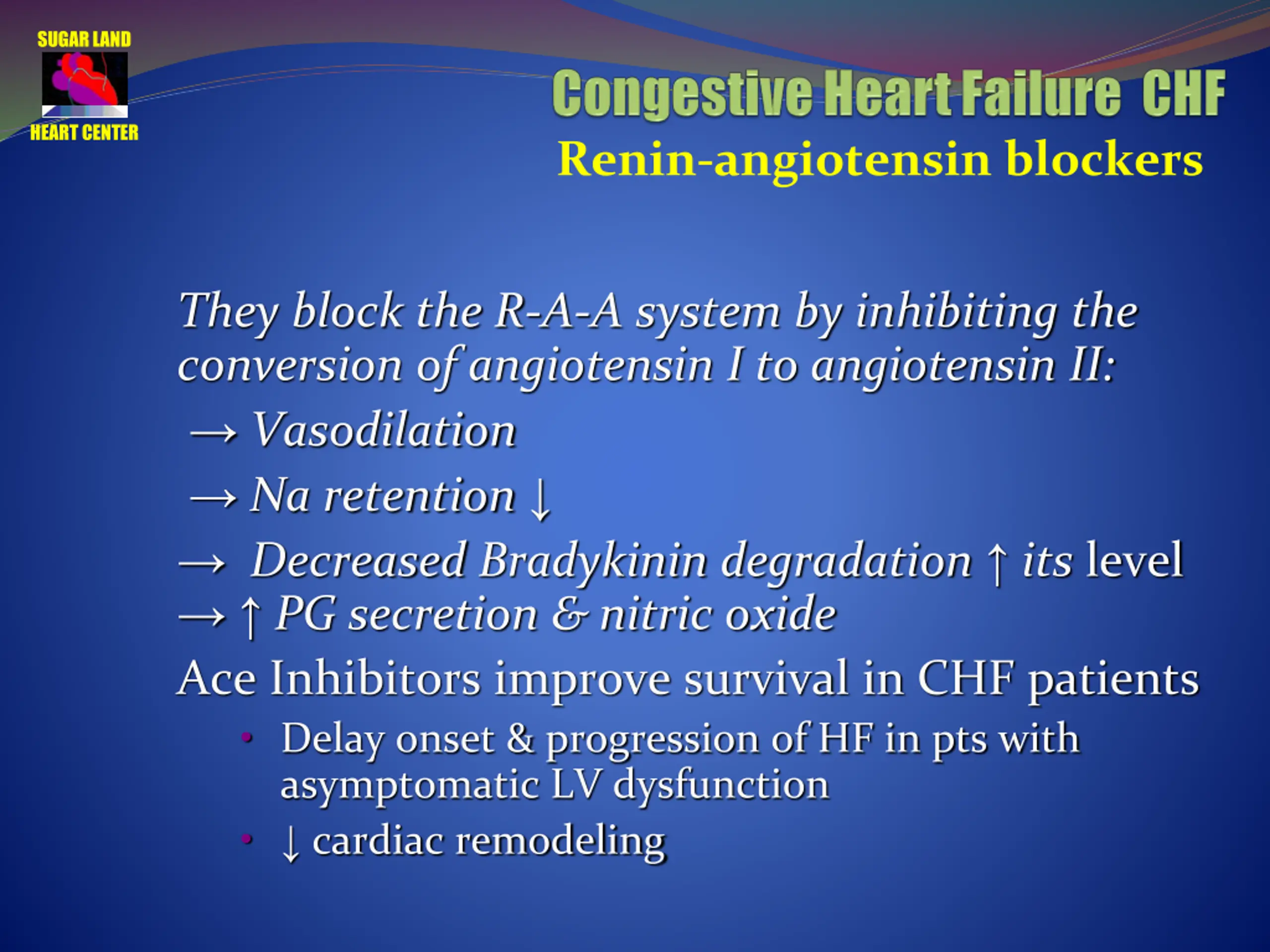 SUGAR LAND HEART CENTER Renin-angiotensin blockers They block the R-A-A system by inhibiting the conversion of angiotensin I to angiotensin II: Vasodilation Na retention Decreased Bradykinin degradation its level PG secretion & nitric oxide Ace Inhibitors improve survival in CHF patients Delay onset & progression of HF in pts with asymptomatic LV dysfunction cardiac remodeling