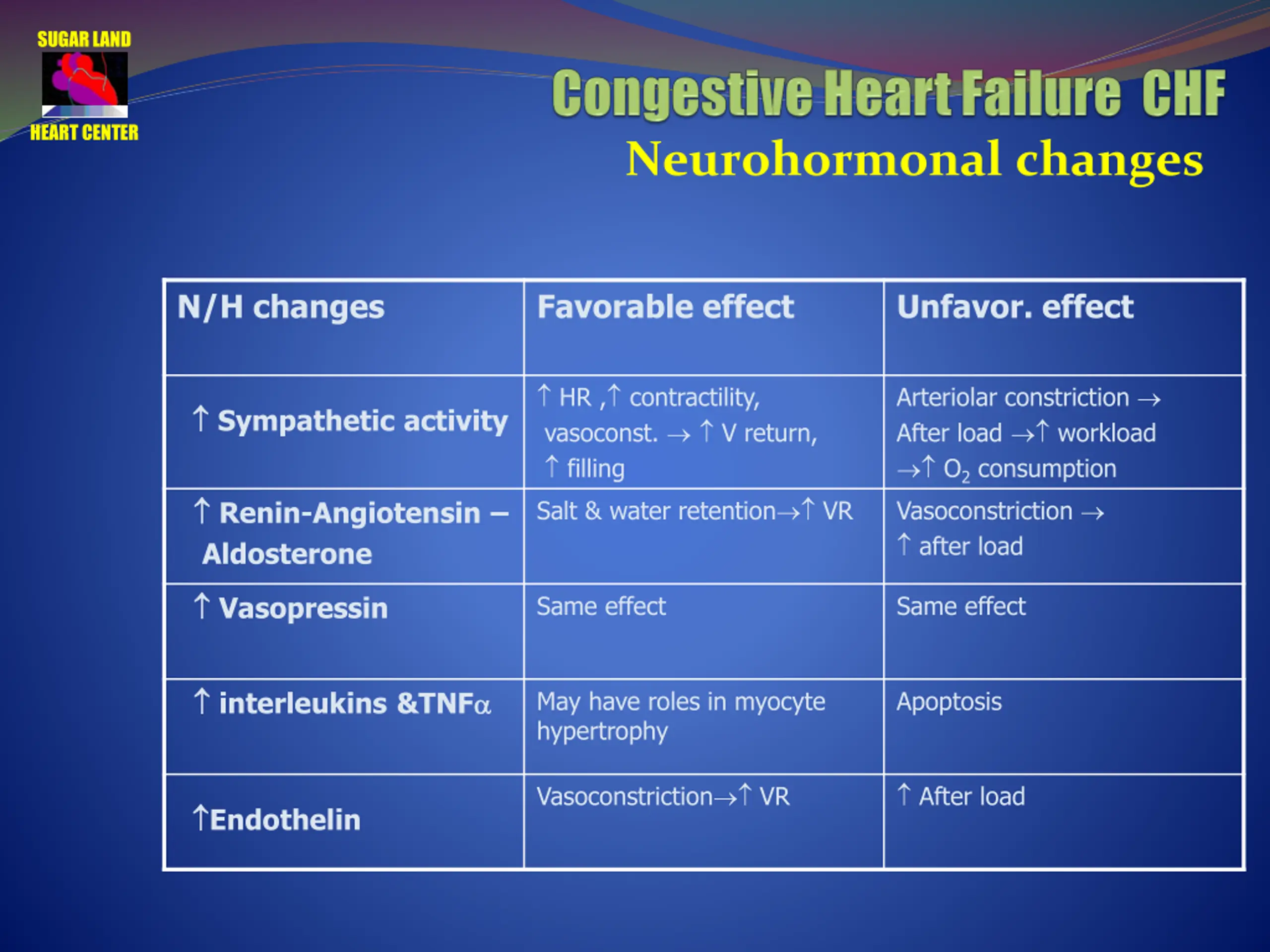 SUGAR LAND HEART CENTER Neurohormonal changes N/H changes Favorable effect Unfavor. effect HR , contractility, vasoconst. V return, filling Salt & water retention VR Arteriolar constriction After load workload O2 consumption Vasoconstriction after load Sympathetic activity Renin-Angiotensin Aldosterone Vasopressin Same effect Same effect interleukins &TNF May have roles in myocyte hypertrophy Apoptosis Vasoconstriction VR After load Endothelin
