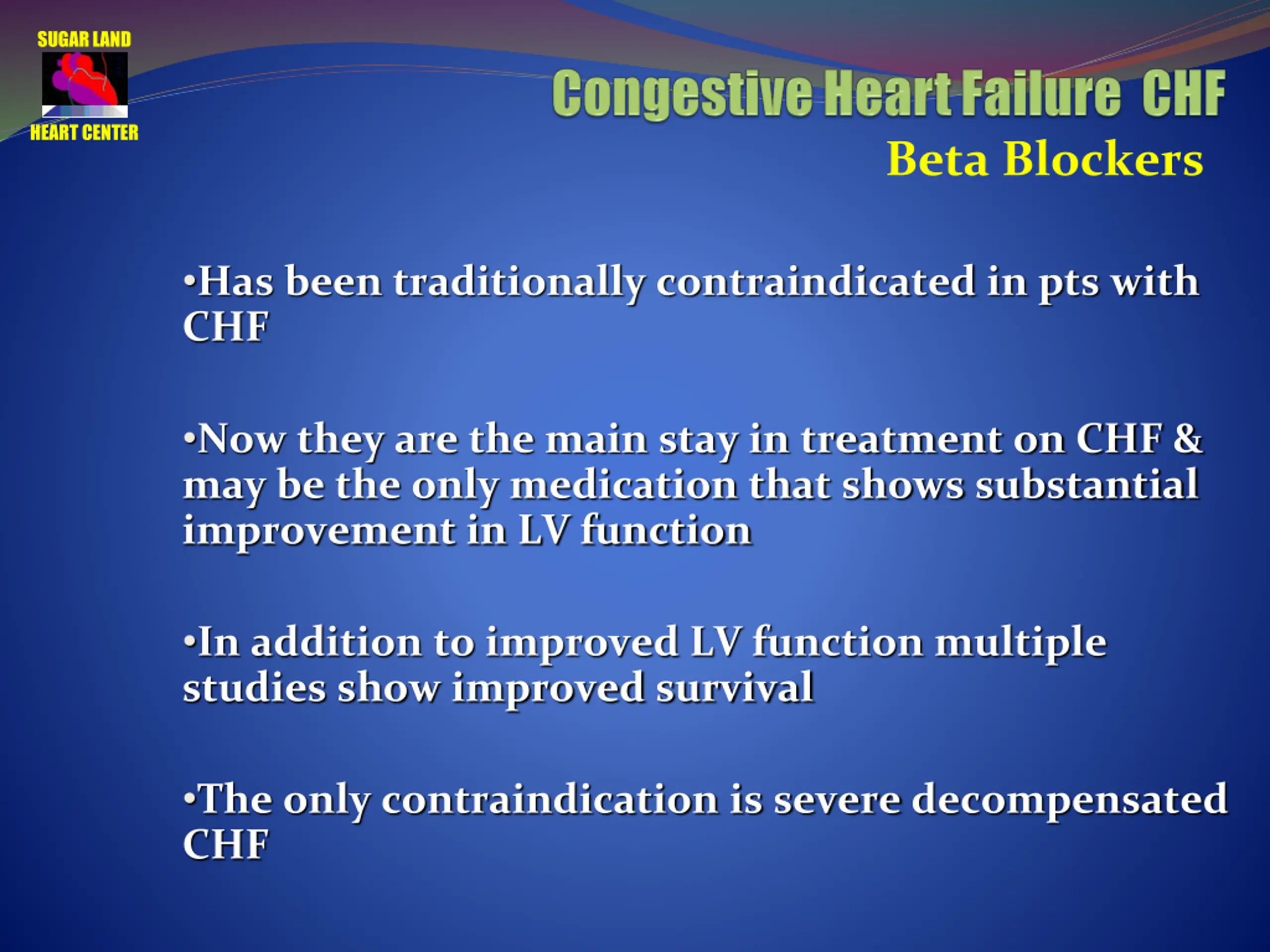 SUGAR LAND HEART CENTER Beta Blockers Has been traditionally contraindicated in pts with CHF Now they are the main stay in treatment on CHF & may be the only medication that shows substantial improvement in LV function In addition to improved LV function multiple studies show improved survival The only contraindication is severe decompensated CHF