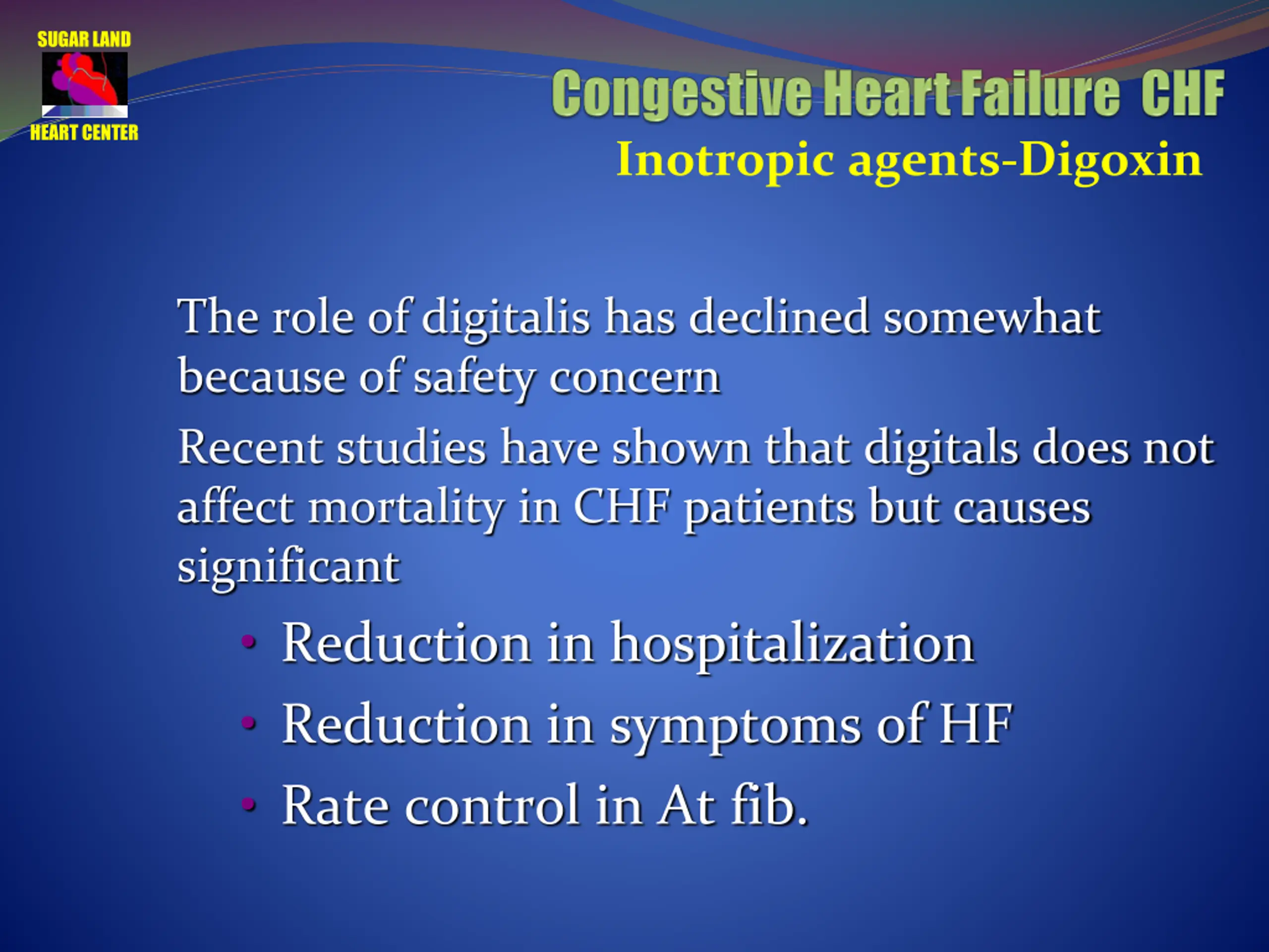 SUGAR LAND HEART CENTER Inotropic agents-Digoxin The role of digitalis has declined somewhat because of safety concern Recent studies have shown that digitals does not affect mortality in CHF patients but causes significant Reduction in hospitalization Reduction in symptoms of HF Rate control in At fib.