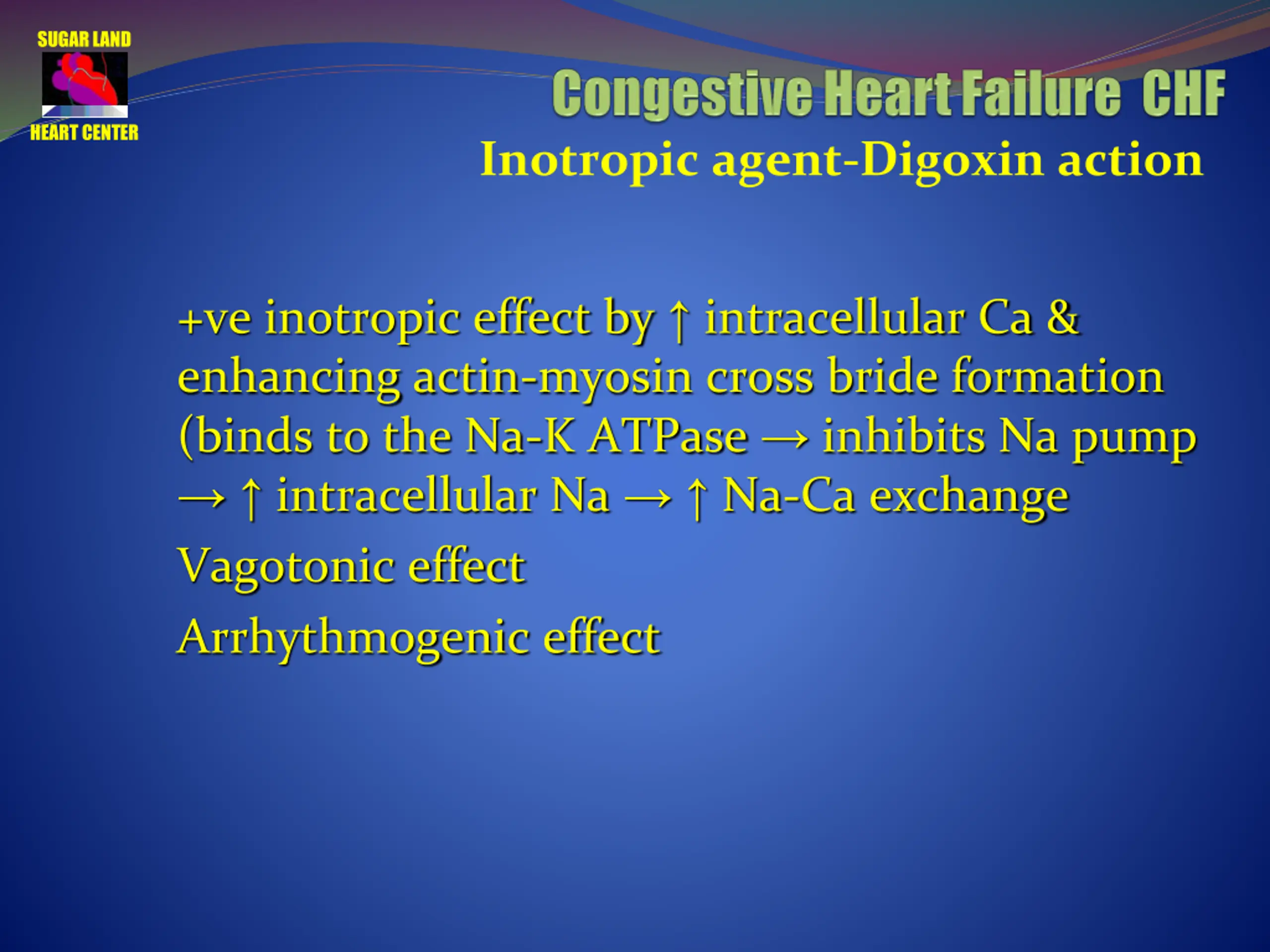 SUGAR LAND HEART CENTER Inotropic agent-Digoxin action +ve inotropic effect by intracellular Ca & enhancing actin-myosin cross bride formation (binds to the Na-K ATPase inhibits Na pump intracellular Na Na-Ca exchange Vagotonic effect Arrhythmogenic effect