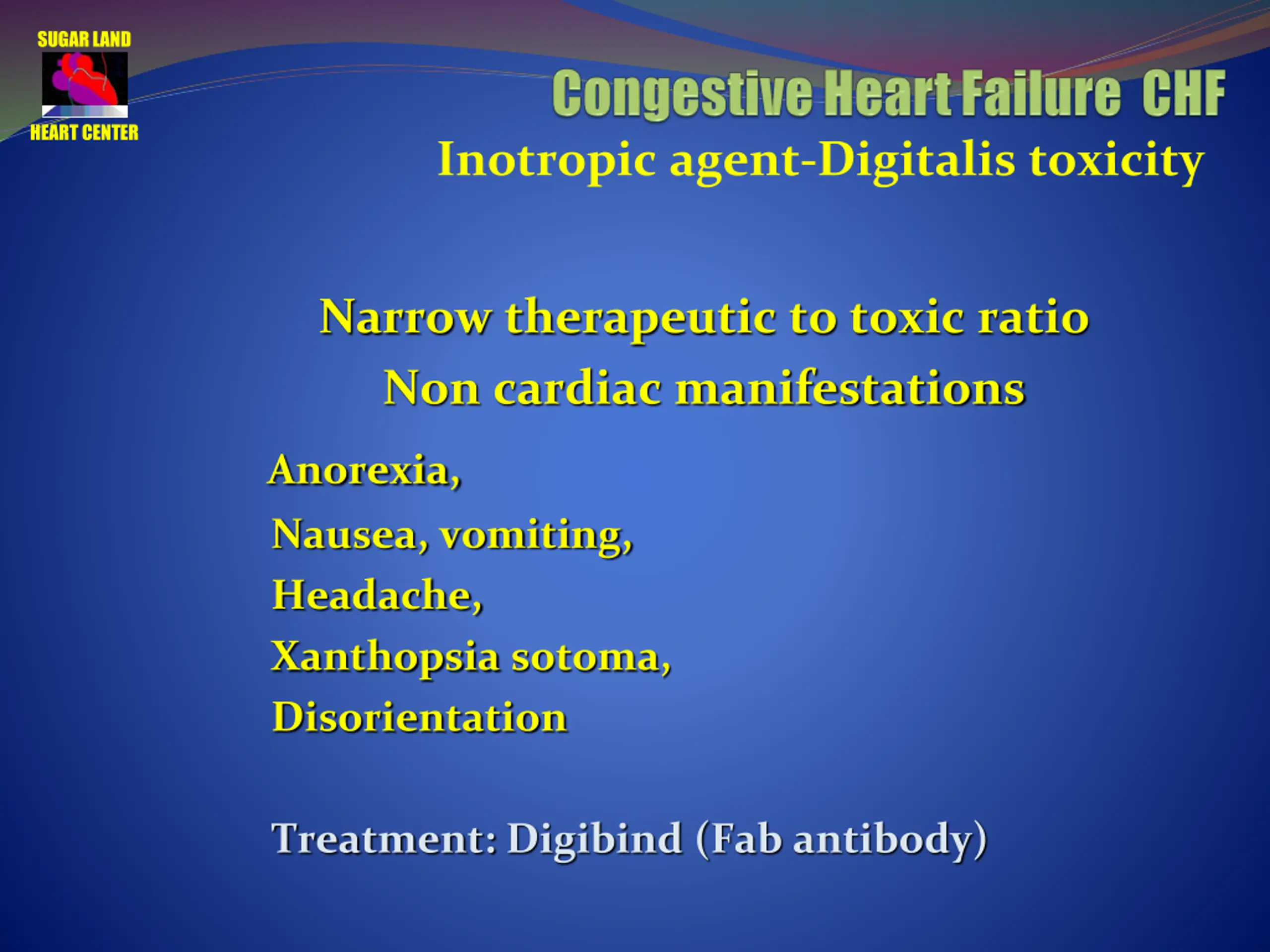 SUGAR LAND HEART CENTER Inotropic agent-Digitalis toxicity Narrow therapeutic to toxic ratio Non cardiac manifestations Anorexia, Nausea, vomiting, Headache, Xanthopsia sotoma, Disorientation Treatment: Digibind (Fab antibody)