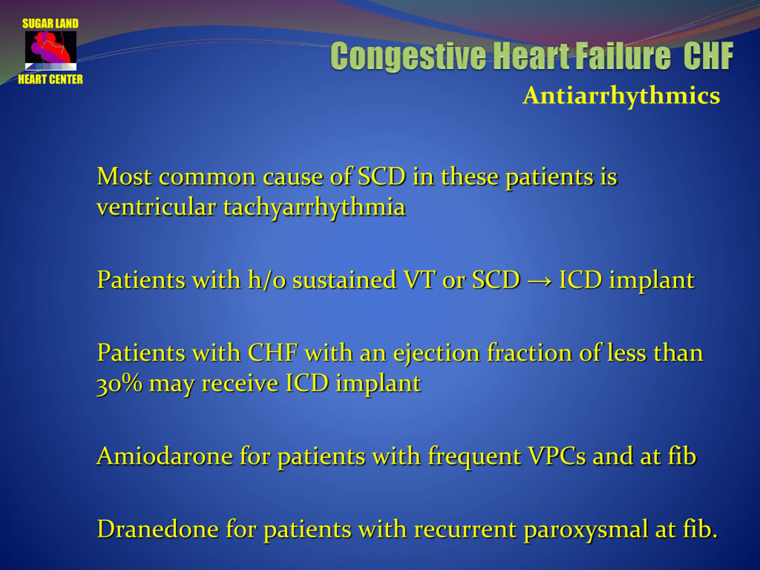 SUGAR LAND HEART CENTER Antiarrhythmics Most common cause of SCD in these patients is ventricular tachyarrhythmia Patients with h/o sustained VT or SCD ICD implant Patients with CHF with an ejection fraction of less than 30% may receive ICD implant Amiodarone for patients with frequent VPCs and at fib Dranedone for patients with recurrent paroxysmal at fib.