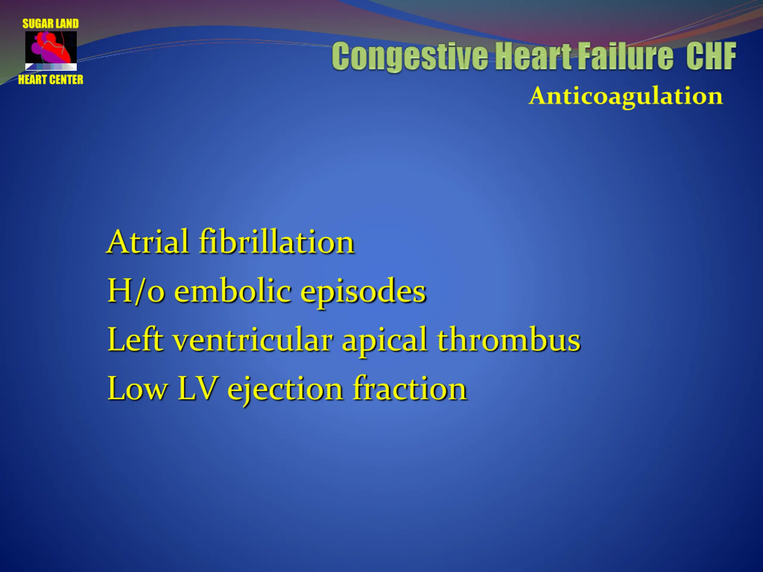 SUGAR LAND HEART CENTER Anticoagulation Atrial fibrillation H/o embolic episodes Left ventricular apical thrombus Low LV ejection fraction