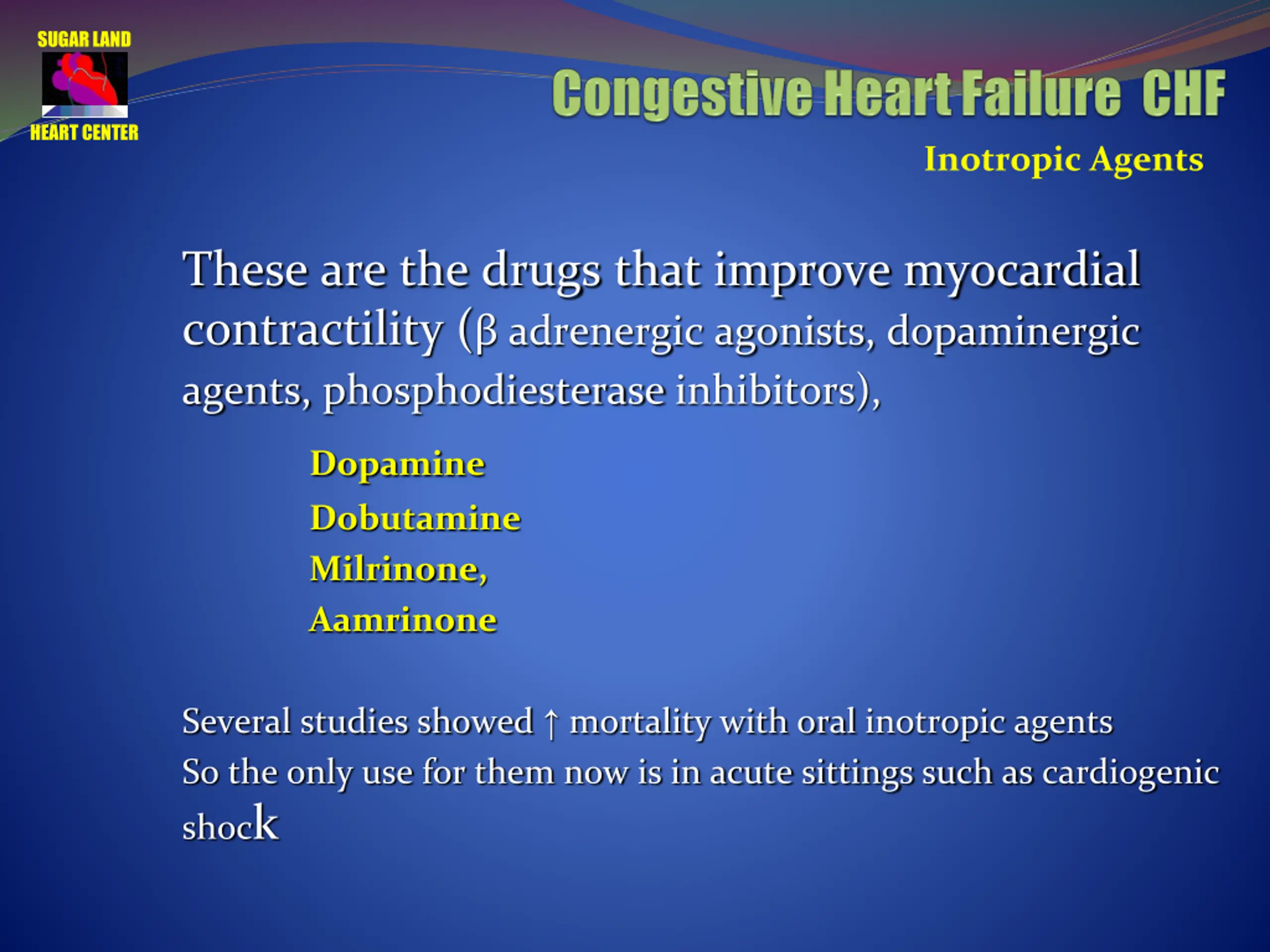 SUGAR LAND HEART CENTER Inotropic Agents These are the drugs that improve myocardial contractility ( adrenergic agonists, dopaminergic agents, phosphodiesterase inhibitors), Dopamine Dobutamine Milrinone, Aamrinone Several studies showed mortality with oral inotropic agents So the only use for them now is in acute sittings such as cardiogenic shock