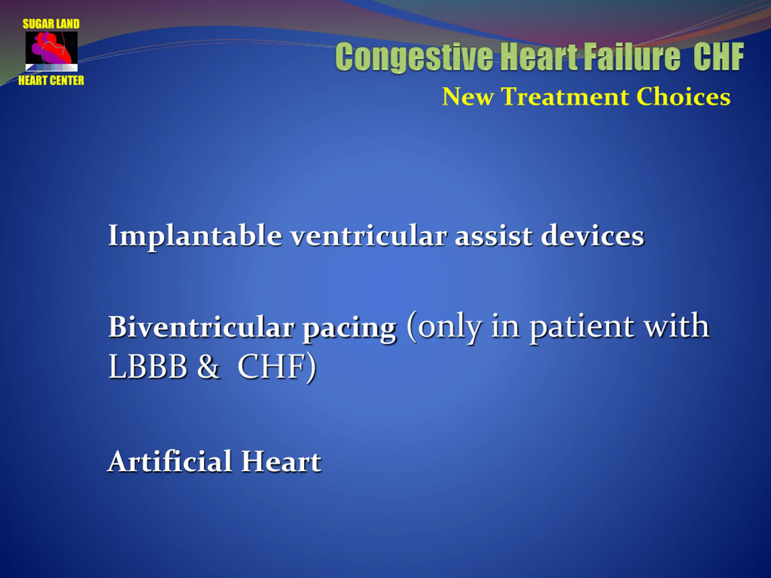 SUGAR LAND HEART CENTER New Treatment Choices Implantable ventricular assist devices Biventricular pacing (only in patient with LBBB & CHF) Artificial Heart