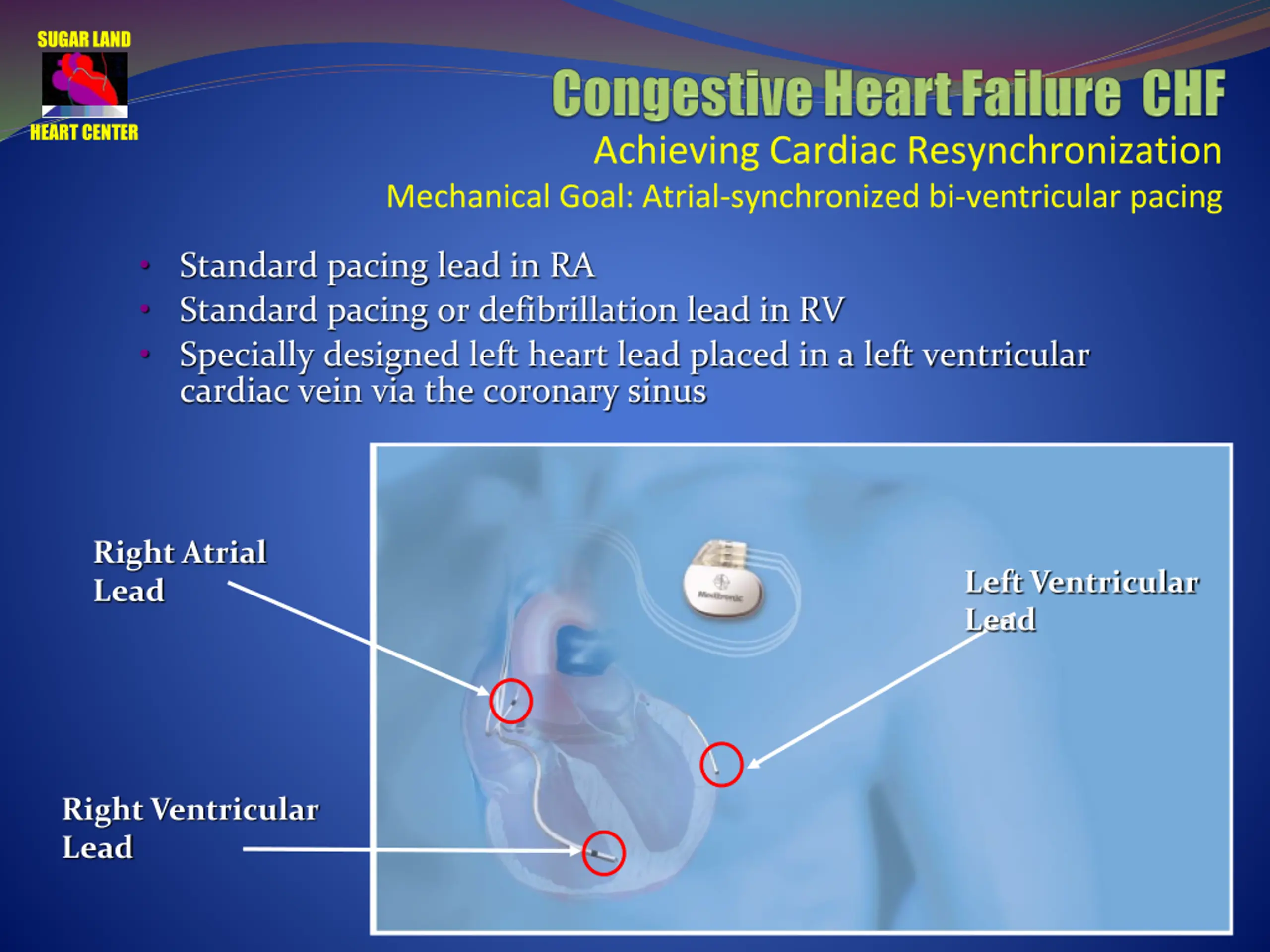 SUGAR LAND HEART CENTER Achieving Cardiac Resynchronization Mechanical Goal: Atrial-synchronized bi-ventricular pacing Standard pacing lead in RA Standard pacing or defibrillation lead in RV Specially designed left heart lead placed in a left ventricular cardiac vein via the coronary sinus Right Atrial Lead Left Ventricular Lead Right Ventricular Lead