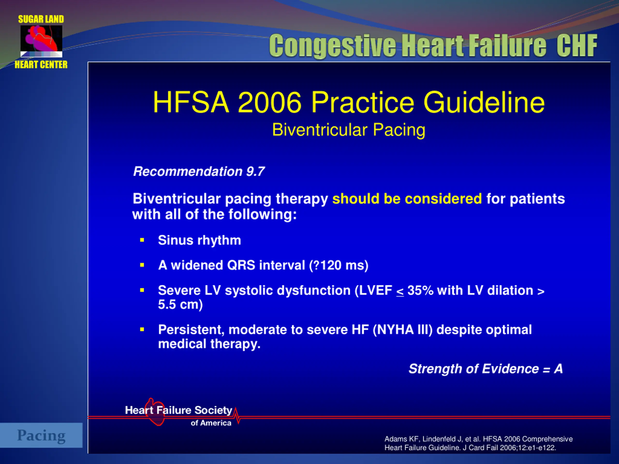 SUGAR LAND HEART CENTER HFSA 2006 Practice Guideline Biventricular Pacing Recommendation 9.7 Biventricular pacing therapy should be considered for patients with all of the following: Sinus rhythm A widened QRS interval (? ?120 ms) Severe LV systolic dysfunction (LVEF < 35% with LV dilation > 5.5 cm) Persistent, moderate to severe HF (NYHA III) despite optimal medical therapy. Strength of Evidence = A Pacing Adams KF, Lindenfeld J, et al. HFSA 2006 Comprehensive Heart Failure Guideline. J Card Fail 2006;12:e1-e122.