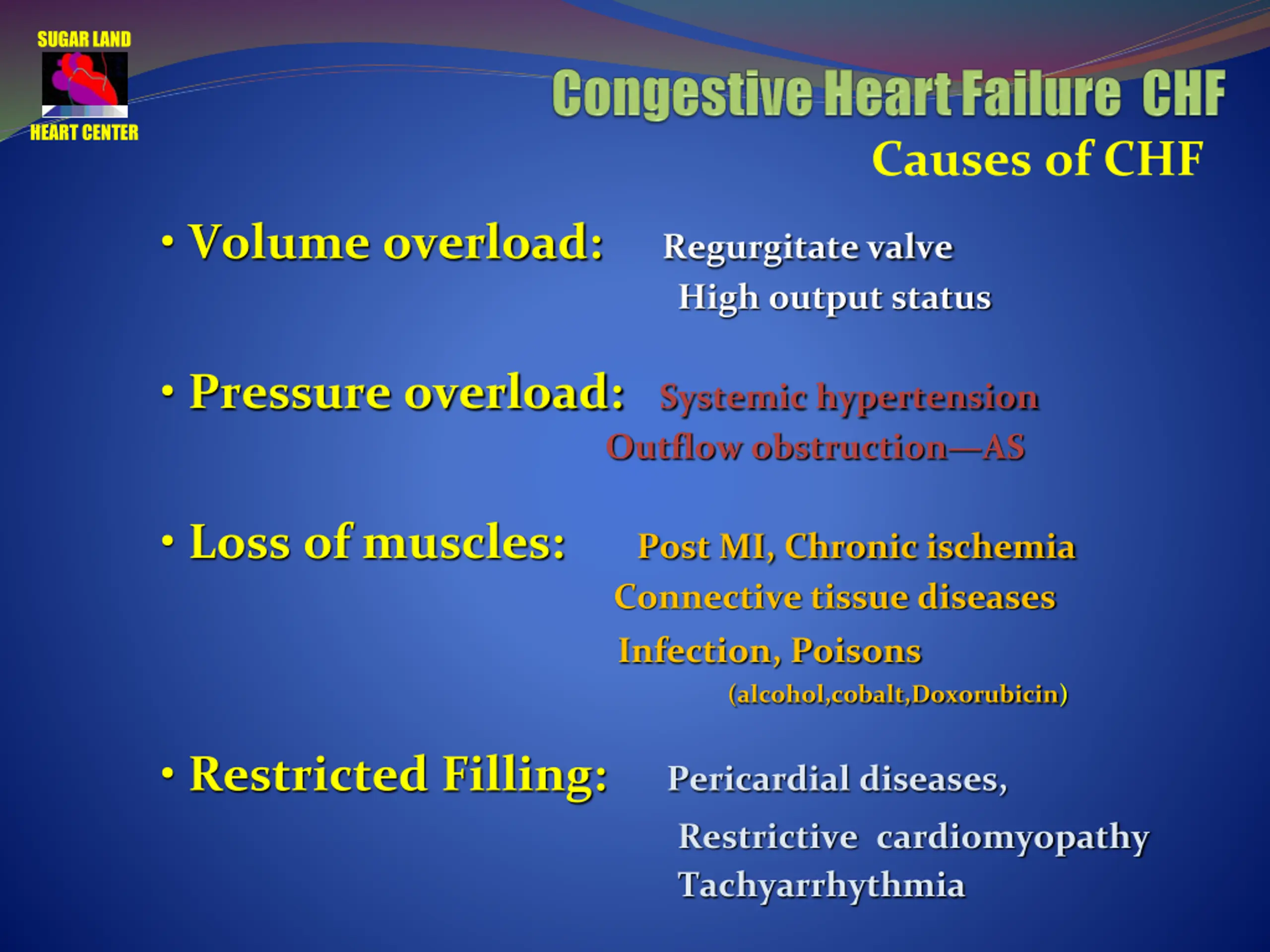 SUGAR LAND HEART CENTER Causes of CHF Volume overload: Regurgitate valve High output status Pressure overload: Systemic hypertension Outflow obstruction AS Loss of muscles: Post MI, Chronic ischemia Connective tissue diseases Infection, Poisons (alcohol,cobalt,Doxorubicin) Restricted Filling: Pericardial diseases, Restrictive cardiomyopathy Tachyarrhythmia
