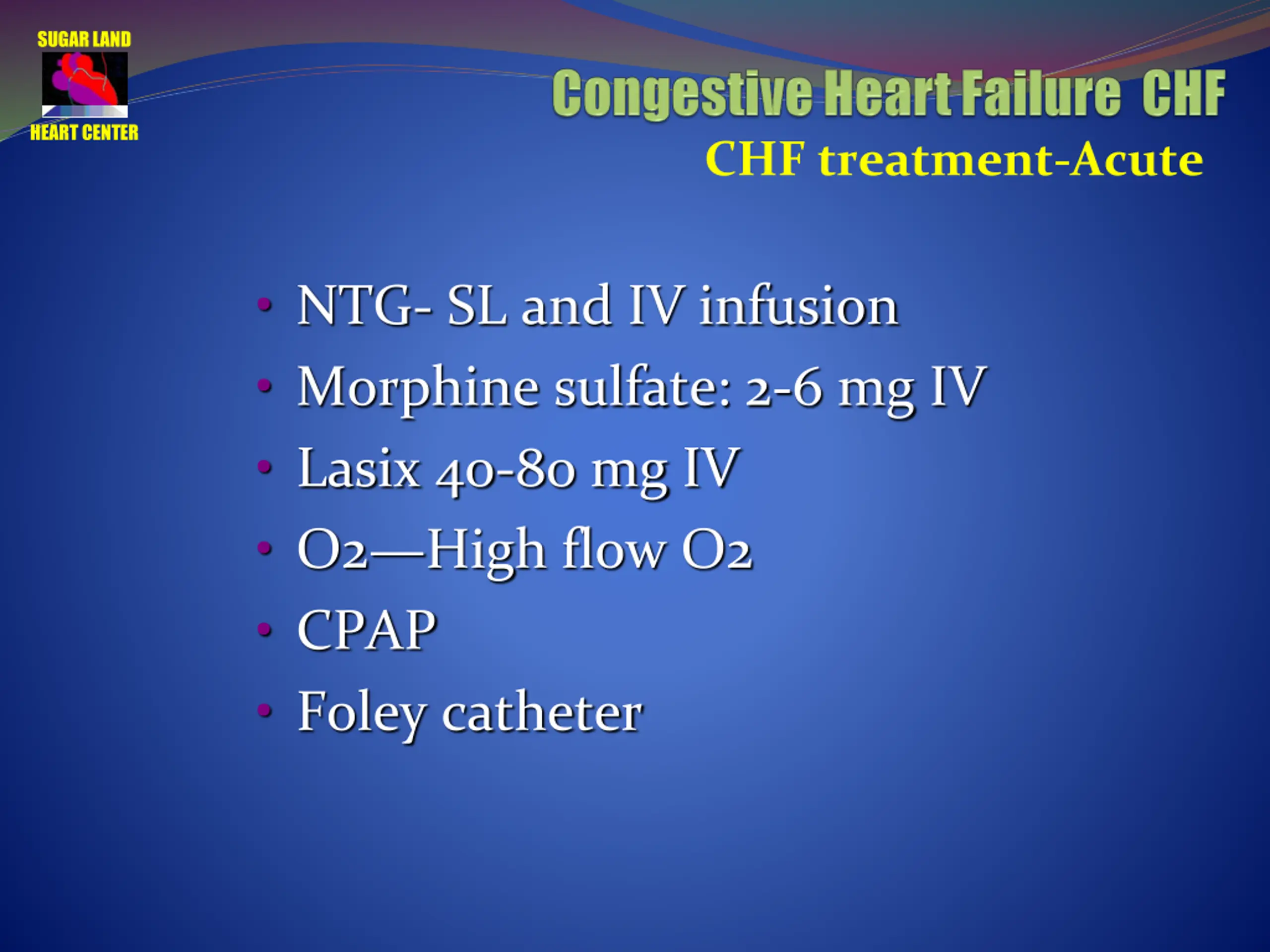 SUGAR LAND HEART CENTER CHF treatment-Acute NTG- SL and IV infusion Morphine sulfate: 2-6 mg IV Lasix 40-80 mg IV O2 High flow O2 CPAP Foley catheter
