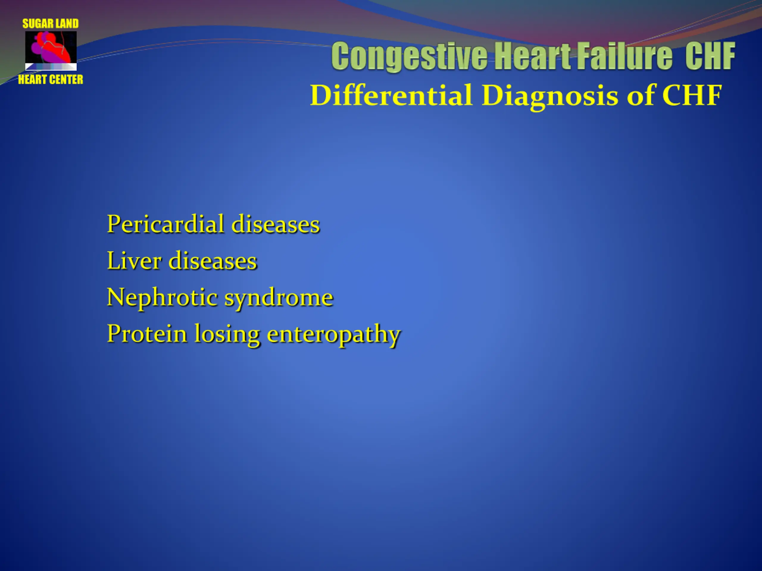 SUGAR LAND HEART CENTER Differential Diagnosis of CHF Pericardial diseases Liver diseases Nephrotic syndrome Protein losing enteropathy